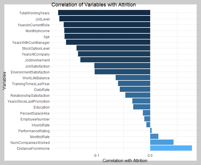 퇴직률(Attrition)이라는 종속변수와 다른 변수들 간의 상관관계를 시각화하는 것은 해당 데이터를 분석하는데 중요한 단계입니다. 이를 통해 어떤 변수가 직원의 퇴직률에 가장 큰 영향을 미치는지 파악할 수 있습니다. 이를 위해, 각 변수와 퇴직률간의 상관관계를 계산하고, 이를 바차트로 시각화해 보겠습니다. 이 역시도 Chat GPT의 도움을 받아 어렵지 않게 코딩을 실시할 수 있었습니다.