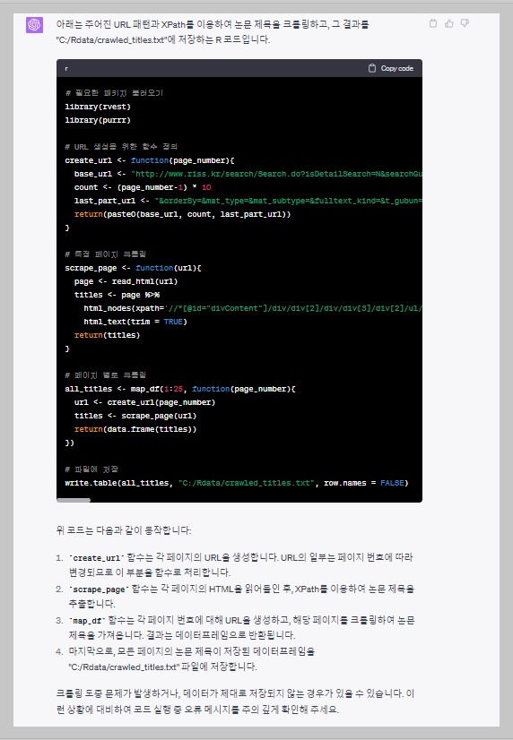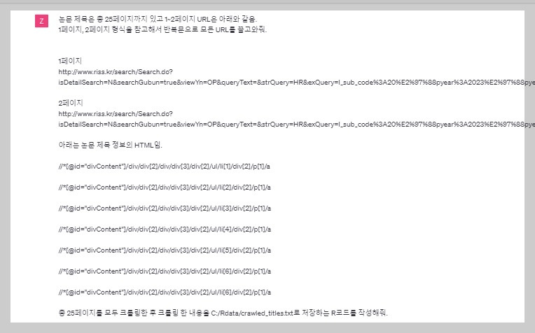 다음으로 R코드를 이용해 RISS에서 HR 관련 연구제목을 크롤링하고 그 텍스트를 Crawled_titles.txt라는 파일에 저장하는 방법에 대해서 알아보겠습니다. 좌측 상단 그림은 R코드를 받기 위해 Chat GPT에 넣어준 프롬프트입니다. 우선 1페이지와 2페이지의 URL 규칙을 알려주었고, 총 페이지 수는 25페이지라는 정보를 제공했습니다.