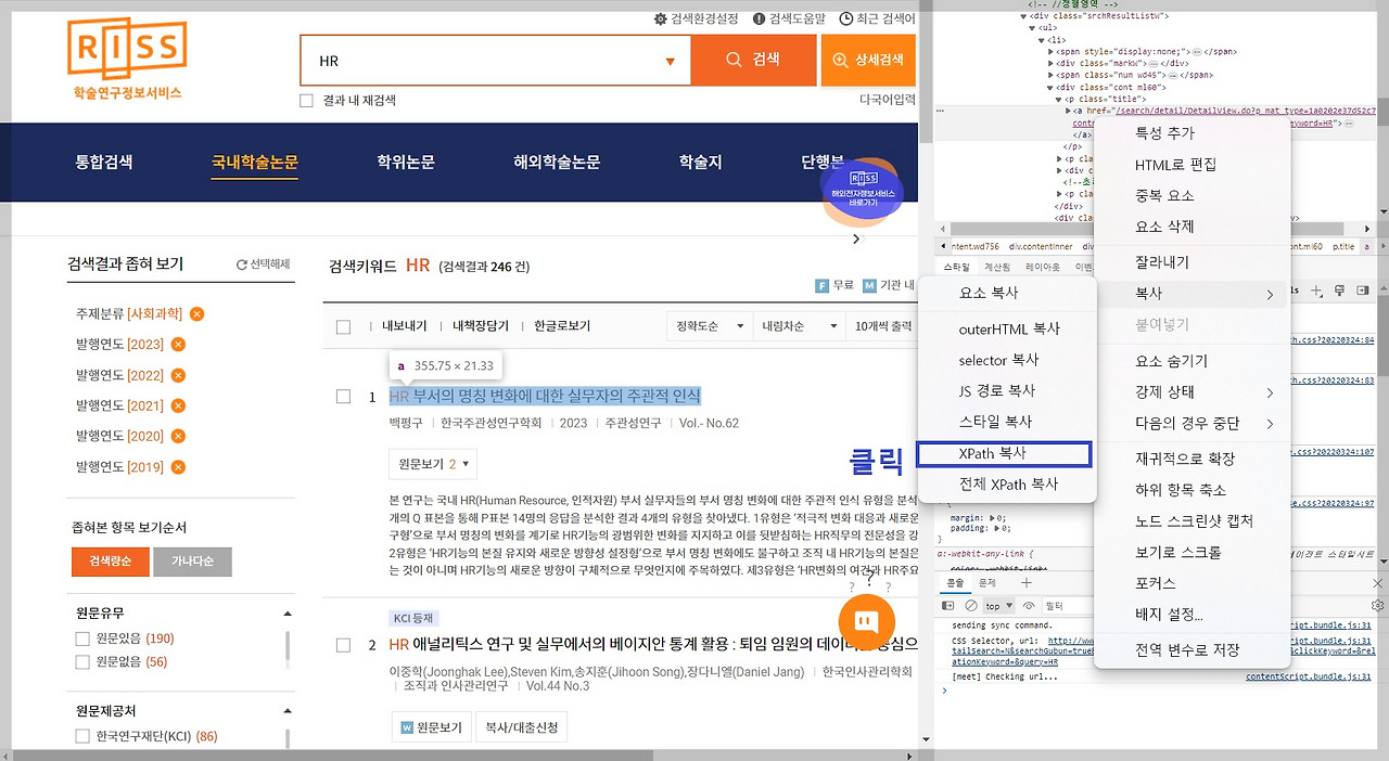 기능을 활성화한 후에는 브라우저 내 연구 제목에 커서를 올려놓고 좌측 버튼 클릭합니다. 제목을 클릭했을 때 '개발자 도구' 창에 제목에 해당되는 HTML 부분을 '개발자 도구' 창에 표시해 줍니다. 해당 창으로 커서를 옮겨서 '개발자 도구' 창에 표시된 제목 부분 HTML 위에서 오른쪽 버튼을 클릭한후 [복사] - [Xpath 복사]를 실행합니다. 이와 같은 방식으로 여러 제목의 HTML을 추출해 냅니다. 복사된 제목 부분의 HTML은 프롬프트에 함께 포함시킬 예정입니다.