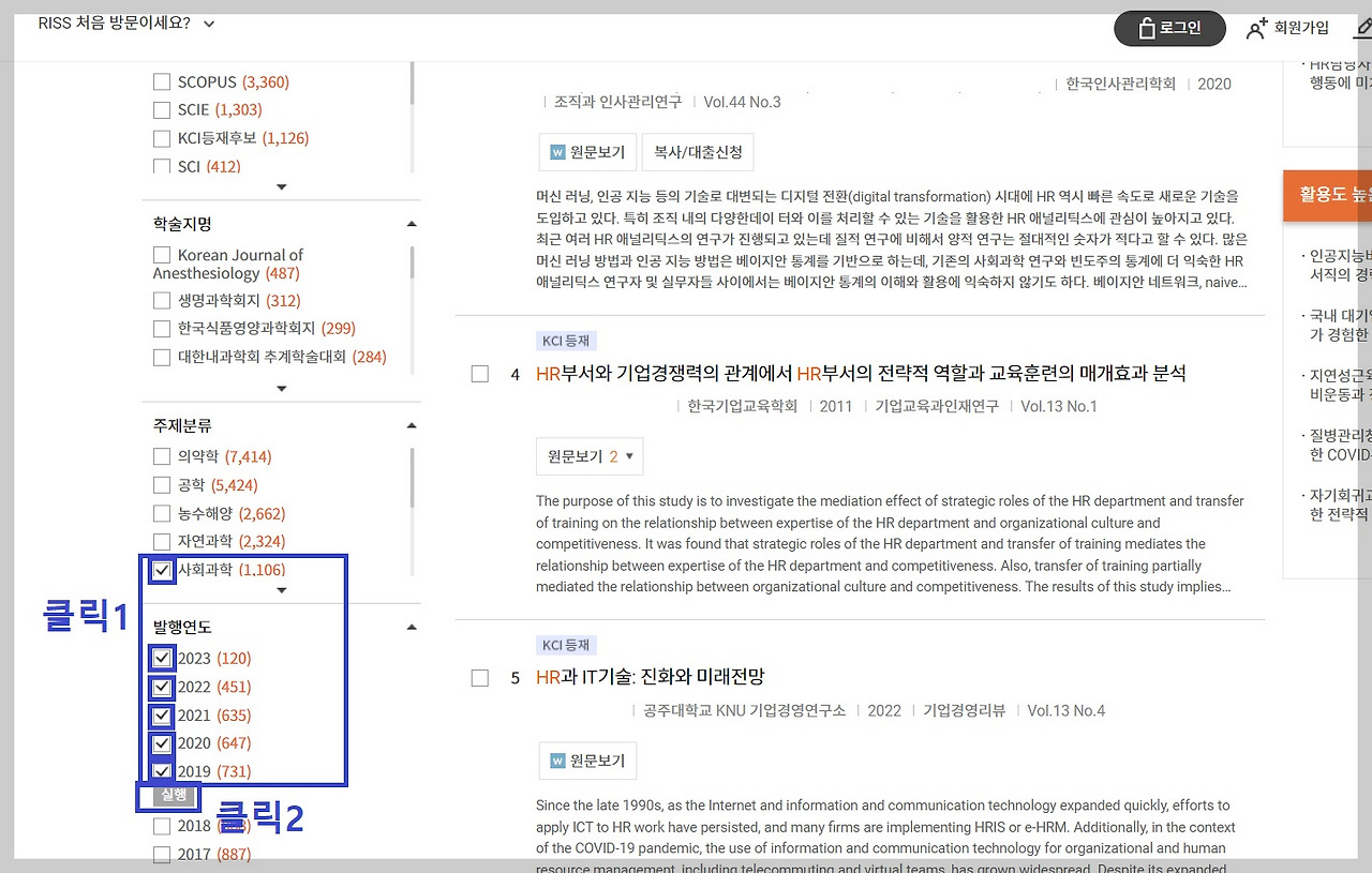 HR키워드를 검색한 후에는 좌측에 위치한 '검색결과 좁혀 보기' 탭에서 '사회과학' 분야와 '2023', '2022', '2021', '2020', '2019'년도를 체크하여 검색 범위를 좁힐 수 있습니다. 이렇게 함으로써 최근 5년간 사회과학 분야에서의 HR 연구 동향에 초점을 맞출 수 있습니다.
