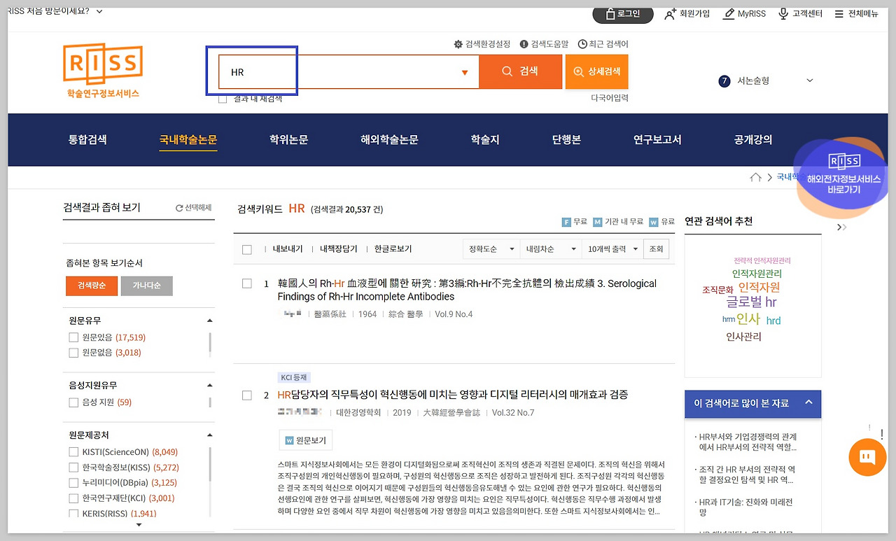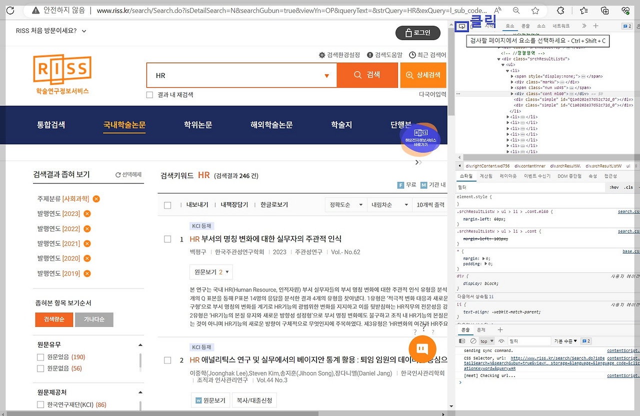 이번 챕터에서는 연구 관련 여러 사이트 중에서도 학술연구정보서비스 사이트( www.riss.com)에 접속하여 2019년 이후 사회과학 분야에서 수행되어 온 HR 관련 연구정보를 크롤링해보겠습니다. 이를 위해 첫 번째로, 먼저 좌측 하단처럼 검색창에 HR 키워드를 넣고 검색을 합니다.