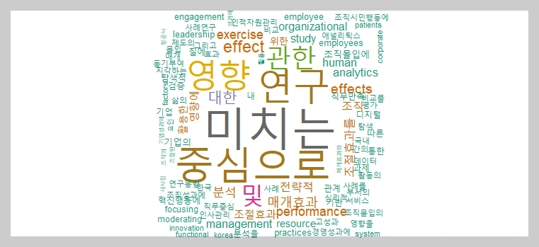 수집된 HR 연구동향 크롤링 데이터를 텍스트 시각화 기법을 활용하여 분석해 보고자 합니다. 텍스트 시각화는 텍스트 데이터를 시각적으로 표현하여 직관적으로 표시하는 방법입니다. 택스트 시각화를 위해서는 위에서 이미 시행한 웹 크롤링 이후에 크롤링된 데이터에 대하여 형태소 분석, 데이터 시각화 과정이 추가적으로 이루어져야 합니다.