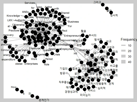 그러나 제한 없이 텍스트 네트워크를 시각화했을 경우 우 데이터의 양이 많아서 시각화가 제대로 안 되는 관계로 연결이 3회 이상 되는 네트워크만 표시되게 하는 R코드를 작성해 달라고 Chat GPT에게 요청하였습니다. 오른쪽 하단 화면은 코드를 입력한 결과로 출력된 시각화 자료입니다. 영어 제목 논문과, 한글 제목 논문이 각 떨어져서 군집을 이루고 있으나 HR이라는 단어를 통해 이어져 있는 것을 살펴볼 수 있습니다.