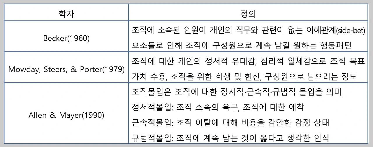 조직몰입이란 개인이 본인 속하는 조직, 조직목표와 본인을 동일시하고 조직구성원으로 계속 남아 있으려는 태도를 의미합니다(Robbins & Judge, 2021). 조직몰입에 대해 정의한 대표적인 학자들의 정의를 살펴보자면 아래 표와 같습니다.