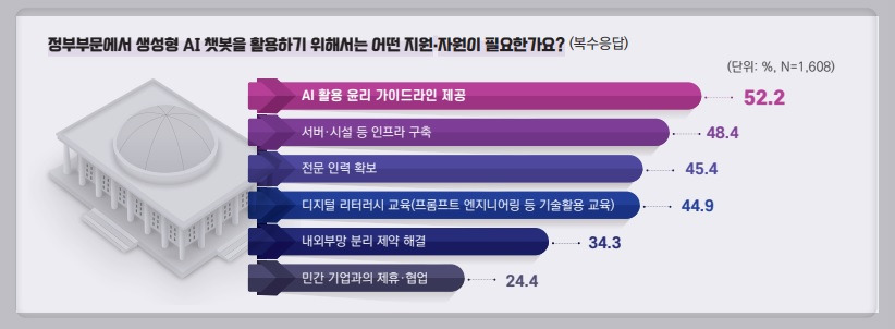 공공부문에서 Chat GPT 활용을 중심으로 한 업무 혁신 논의는 2022년 11월 Chat GPT 출시 이후 활발하게 진행되었습니다. '디지털플랫폼정부 실현계획'에 따라, 공공부문에서의 생성형 AI 활용이 본격화될 예정입니다. 이러한 정책의 성공적 진행을 위해선 실질적으로 생성형 AI를 활용하게 될 공무원의 필요사항을 정책에 잘 반영하는 것이 중요합니다. 조사 결과를 살펴보면, 공무원은 AI 활용 윤리 가이드라인 구축, AI 관련 인프라 구축, 그리고 AI 전문 인력 확보 등을 주요한 지원 요소로 인식하고 있습니다.