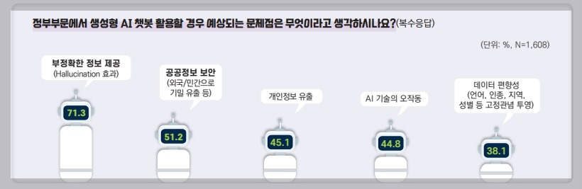 '챗GPT 및 생성형 AI 챗봇 활용 인식조사' 결과에 따르면, 중앙정부와 지방자치단체의 공무원들은 Chat GPT의 활용에서 발생할 수 있는 문제점을 잘 인식하고 있었습니다. 이들이 중요하게 인식하고 있는 문제점으로는 부정확한 정보 제공(71.3%), 공공정보 보안(51.2%), 개인정보 유출(45.1%), AI의 오작동(44.8%), 데이터 편향성(38.1%) 등이 있었습니다.