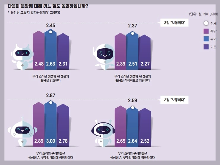 (출처: 김다니, 2023, KIPA Data Brief 보고서) 생성형 AI 챗봇에 대한 조직 내 인식 및 지원 수준을 5점 만점으로 평가한 결과, 대체로 중간 수준 이하로 나타났습니다. 구체적으로 '우리 조직은 생성형 AI 챗봇의 활용을 강조한다'는 항목이 2.45점, '우리 조직은 생성형 AI 챗봇의 활용을 적극적으로 지원한다'는 항목이 2.37점, '우리 조직의 구성원은 생성형 AI 챗봇의 활용에 긍정적이다'는 항목이 2.87점, 그리고 '우리 조직의 구성원들은 생성형 AI 챗봇의 활용에 적극적이다'는 항목이 2.59점으로 조사되었습니다.