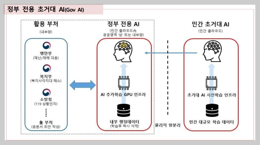 2023년 4월 디지털플랫폼정부위원회는 민간의 초거대 AI 인프라에 (온나라)생성문서, 보도자료 등 정부의 내부정보를 학습시켜 세계 최초로 ‘정부용 초거대 AI’ 만드는 방안을 발표하였습니다. 이날 발표한 정부용 초거대 AI 방안은 총 2단계로 나누어져 있습니다.