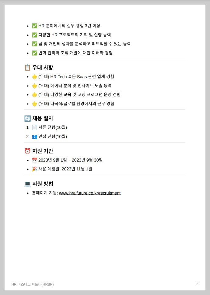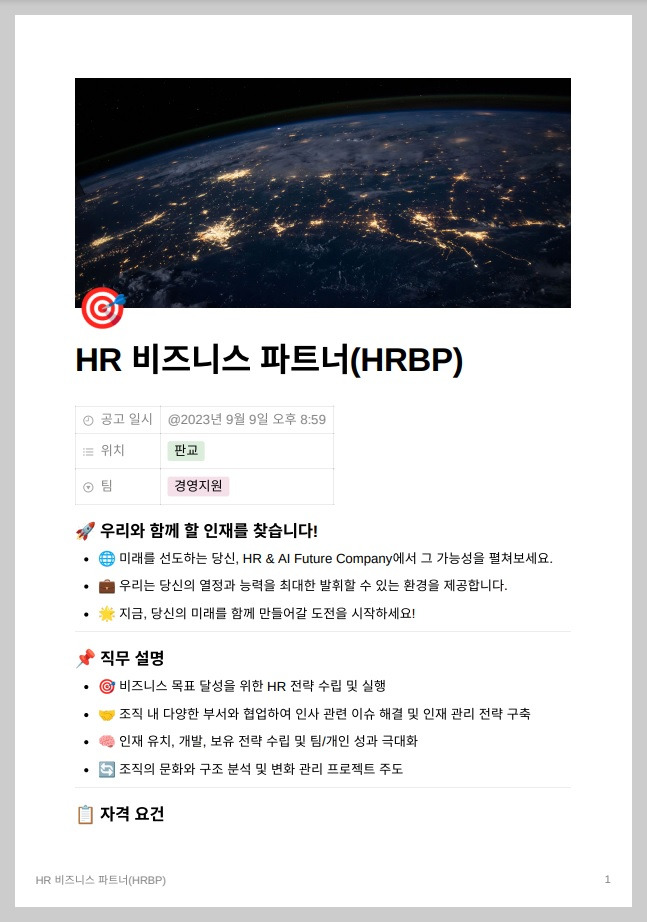 (사진) Notion AI 채용홈페이지에 작성한 HRBP 채용 공고
