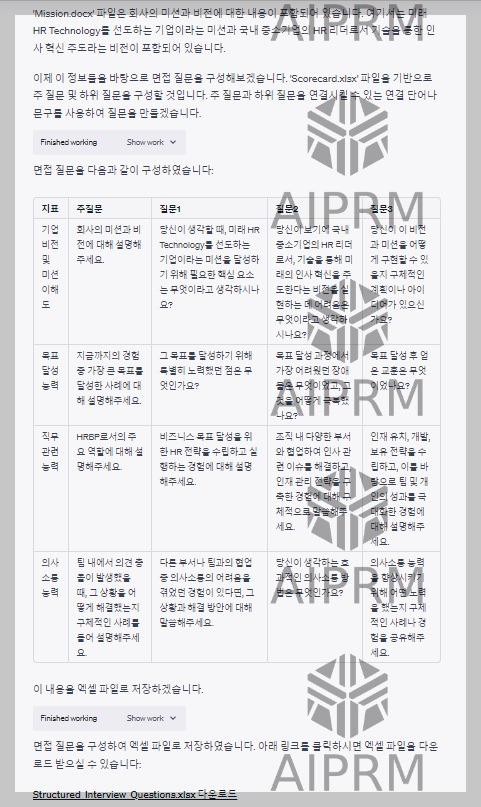 기업의 미션-비전 내용, 채용 공고, Job Description, 면접전형 평가표를 한 파일로 압축하고 Chat GPT Data Analyst에게 제공하였습니다. Chat GPT Data Analyst에게 프롬프트를 통해 압축된 파일을 모두 고려하여 구조화된 면접 질문과 후속질문을 엑셀파일로 만들어달라고 요청하였습니다.