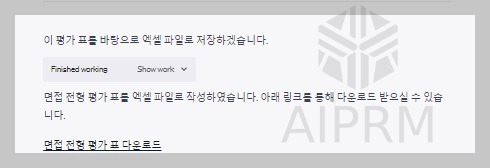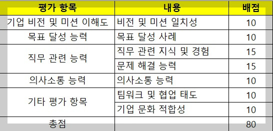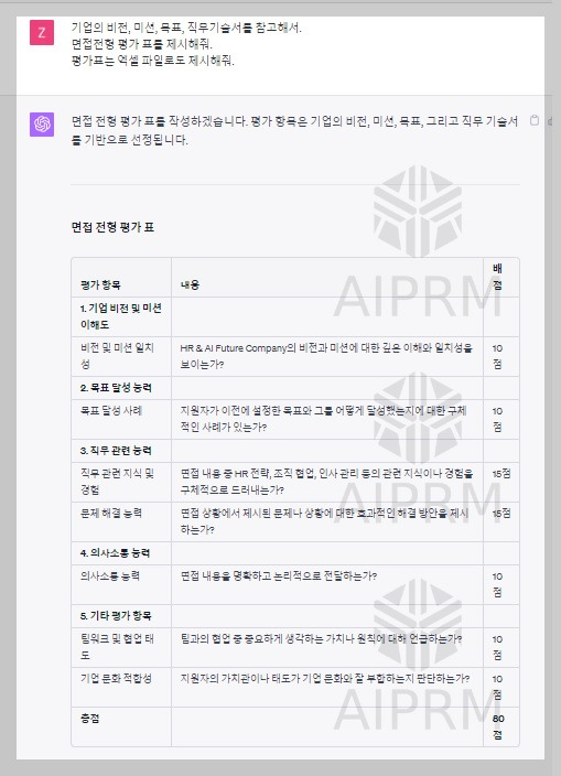 Chat GPT Data Analyst에게 기존 기업의 미션, 비전, 목표, 직무기술서 등을 참고해서 면접전형 평가표를 만들고, 평가표를 엑셀파일로 제시해 달라고 요청하였습니다. 그 결과 Chat GPT는 면접전형 평가표를 80점 만점으로 제시해 주고 그 표를 엑셀로도 다운로드할 수 있게 평가표를 제공해 주었습니다.