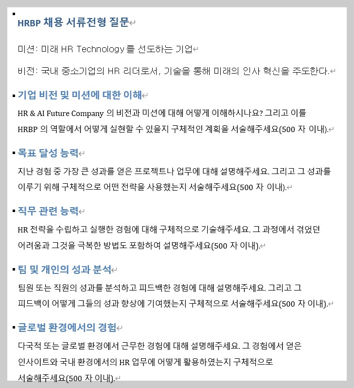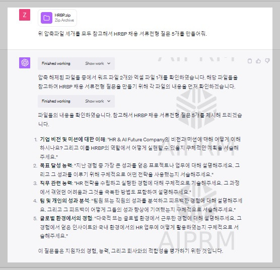 HRBP에 대한 직무기술서(JD), 채용 공고문(JA), 그리고 서류전형 평가표를 HRBP.ZIP 파일로 압축했습니다. 이 압축 파일을 Chat GPT Data Analyst에 업로드하고, 해당 데이터를 바탕으로 서류전형에 사용될 5개의 질문을 생성해 달라고 요청했습니다. 그 결과, Chat GPT로부터 5개의 질문을 제공받았습니다.