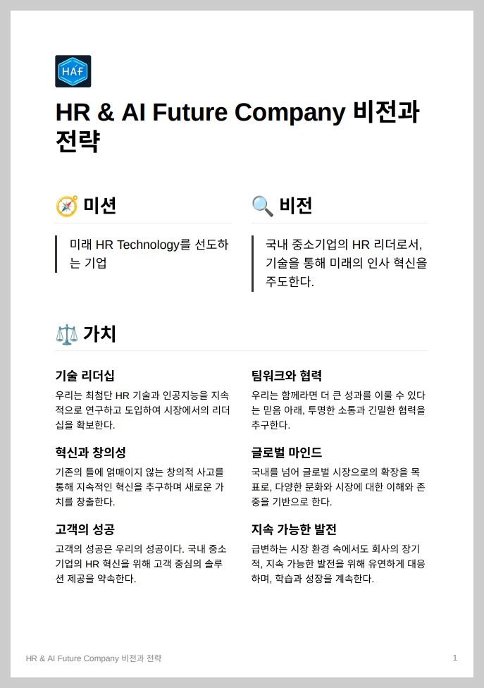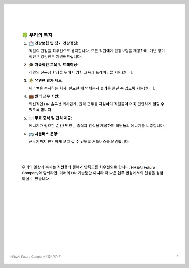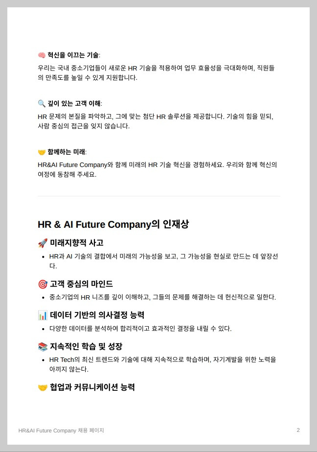 지금까지 가상의 기업 'HR&AI Future Company'을 만든 후, 기업 전략을 생성하고 AI 기술을 활용하여 채용업무를 수행하는 과정을 살펴보았습니다. 이를 통해 HR 업무에서 AI 기술을 활용한 효율성 향상에 대한 잠재력을 확인할 수 있었습니다.