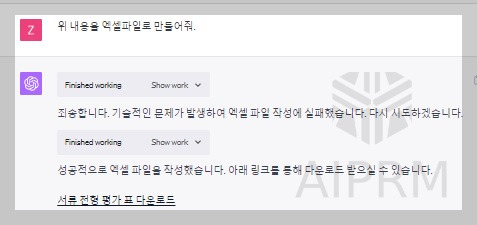 (상) Chat GPT를 통한 서류평가표 도출, (좌하) 평가표 엑셀파일 요청, (우하) 평가표 엑셀파일 내용