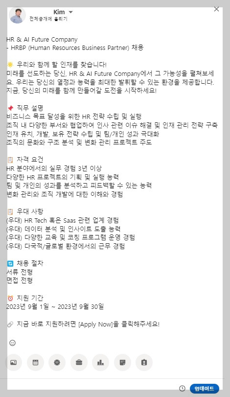 위에서 작성된 채용 공고문을 링크드 형식에 맞춰 작성해 달라고 Chat GPT에 요청하였습니다. 요청한 결과 Chat GPT는 링크드인 채용 공고문 형식에 맞게 답변을 해주었습니다. 해당 공고문을 복사하여 링크드인에 붙여 넣기 하면 바로 링크드인 채용 공고문을 손쉽게 완성할 수 있습니다.