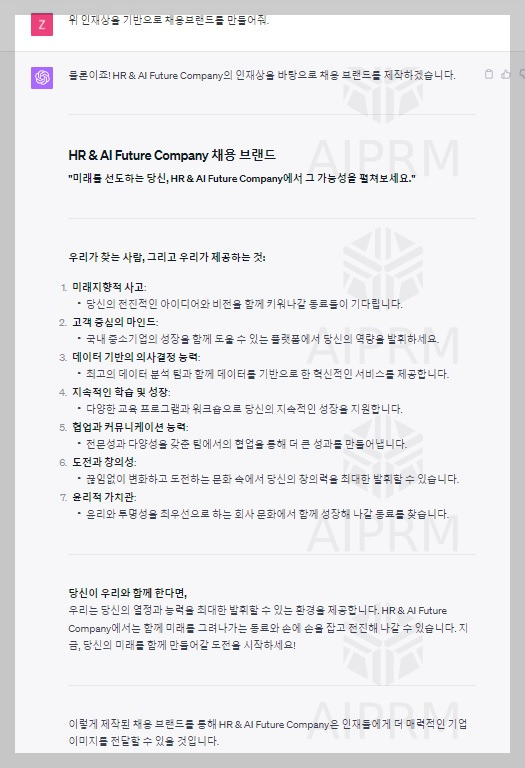 채용브랜드 작성을 하기 위해서는 Chat GPT, copy ai 등을 활용할 수 있습니다. HR&AI Future Company에 맞는 채용브랜드 작성을 위해 회사의 미션, 비전 등을 토대로 'HR&AI Future Company 인재상'을 도출하고 이 인재상을 토대로 채용브랜드를 작성해 달라고 요청했습니다. 아래 화면을 통해 확인할 수 있는 바와 같이 Chat GPT, copy.ai를 활용하여 각각 채용브랜드를 작성해 보았습니다.