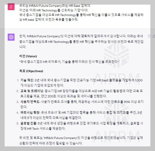 채용 브랜드 구축을 위해서는 기업의 미션, 비전, 목표가 필요합니다. Chat GPT에게 가상의 기업 'HR&AI Future Company'의 미션을 제시한 뒤에 이 기업의 비전과 목표를 요청하였습니다. 미션, 비전, 목표를 도출합니다. 하지만, 실제 기업 환경에서는 이러한 미션, 비전, 목표 등을 Chat GPT와의 대화만을 통해 도출하는 것보다는 이를 토대로 전문가 지원, 직원과의 소통 및 참여 등을 병행하여 결정하는 것이 바람직합니다.