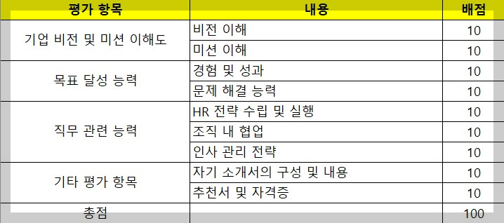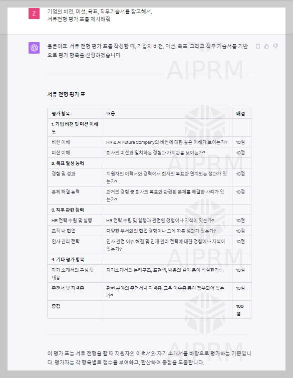 채용을 진행할 때, 서류전형의 채점 기준과 문항 생성은 직무 기반 채용이라면 직무분석 데이터와, 역량 기반 채용이라면 역량모델링 데이터와 연동되어야 합니다. 하지만 이 글에서는 가상의 기업 설정을 기반으로 채용 공고와 전형을 구성하므로, 이미 직무분석 및 역량모델링이 완료된 것으로 가정하겠습니다. Chat GPT에게 서류전형 평가표를 기업 비전, 미션, 목표, 직무기술서를 참고하여 작성해 달라고 요청하으며, Chat GPT Data Analyst를 통해서는 평가표를 엑셀파일로 만들어달라고 요청하였습니다.