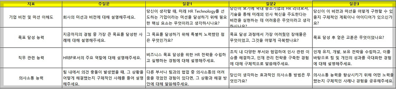 Chat GPT Data Analyst에 요청하여 평가표의 평가항목을 기준으로 구조화된 면접 질문표를 엑셀 파일로 제공받았습니다. 해당 파일에서는 평가항목별 면접 질문이 구성되어 있으며, 이는 아래 화면에서 확인 가능합니다. 만약 '기업 비전 및 목표 이해도', '목표 달성'과 같은 기본 평가항목 외에 '비전 및 미션 일치성', '목표 달성 사례', '직무 관련 지식 및 경험' 등의 하위 항목을 기준으로 한 구조화된 면접 질문표를 받길 원하신다면, Chat GPT Data Analyst에 해당 내용을 기준으로 면접 질문표를 요청하시면 됩니다. 그러면 해당 내용에 맞춰 구체적인 질문을 제공받으실 수 있습니다.