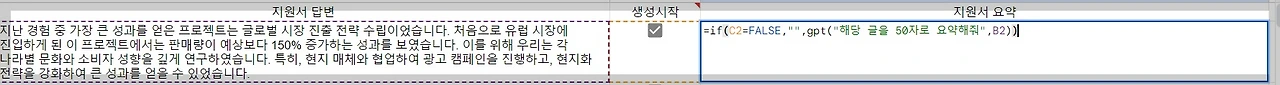 구글 스프레드시트에 GPT API Key를 연동하여 지원서 내용을 50자로 요약하는 작업을 진행할 수 있습니다. 전체 행의 명령어는 2행에 작성한 명령어를 다음 행에 드래그하여 일괄 입력합니다. 지원서의 답변은 일반적으로 채용 시스템을 통해 접수받을 경우 어렵지 않게 엑셀이나 구글 스프레드시트 형식으로 데이터를 추출 가능합니다. 이를 복사하고 구글 스프레드시트에 붙여넣기 하여 지원서를 신속하게 지원서를 요약할 수 있습니다. 이런 방식을 활용하면, 많은 지원자의 정보를 요약해서 빠르게 검토할 수 있고, 상세한 내용은 스프레드시트의 왼쪽에서 함께 확인할 수 있어 평가하기에 편리합니다.