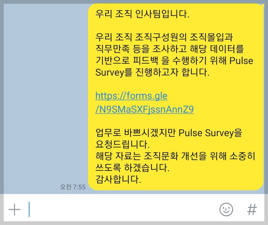 조직 내 Pulse Survey 실시는 복잡한 기술이나 방법론이 필요하지 않습니다. Google Forms와 Chat GPT의 활용만으로도 조직구성원의 니즈 파악하고 이를 고려한 소통을 실시할 수 있으며, 이를 통해 조직의 생산성을 향상 시킬 수 있습니다. Pulse Survey를 통해 조직은 조직구성원의 생각과 감정을 더욱 정확하게 파악할 수 있으며, 조직구성원은 조직 내 적극적인 소통과 이를 통한 피드백으로 자신의 가치를 확고하게 인지할 수 있습니다. 이와 같이 과학적 방법론에 근거한 상호 존중의 의사소통을 통해 조직은 좀 더 건강하고 혁신적인 문화를 구축할 수 있을 것입니다.
