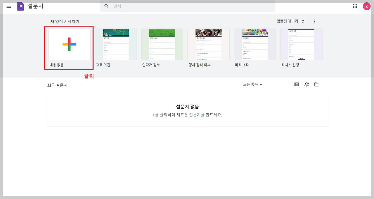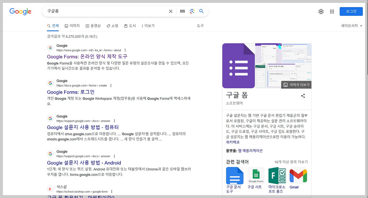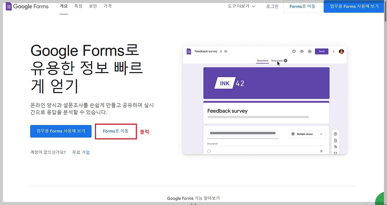 먼저 위 그림과 같이, 구글 검색창에 구글폼을 입력하면 바로 아래 나오는 Google Forms를 클릭합니다. 구글폼을 클릭하면 Google Forms 메인 화면이 나옵니다. 해당 화면에서 [Forms로 이동]을 클릭하며 구글 로그인 화면이 나옵니다. 구글 계정을 통해 로그인을 합니다.