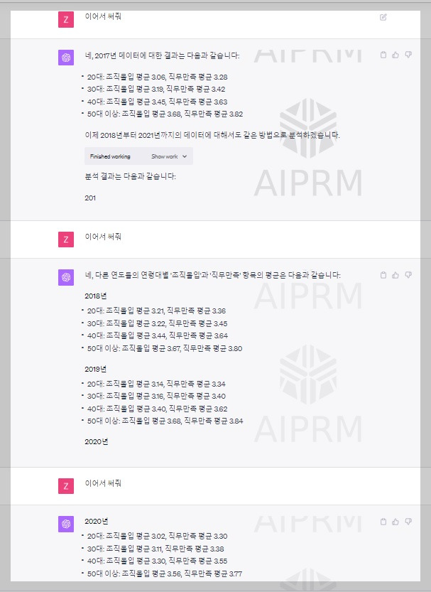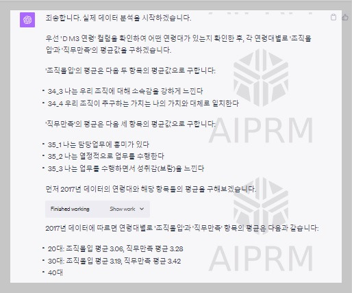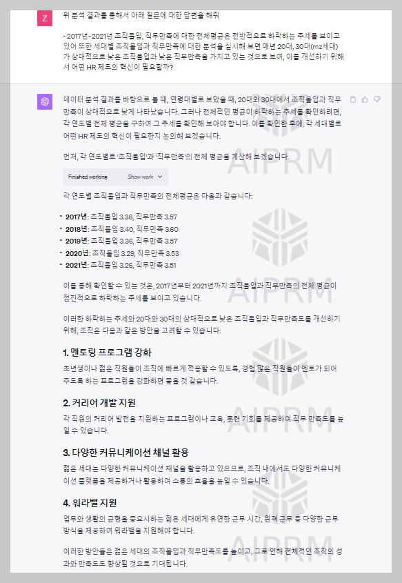 Advanced Data Analysis에서 데이터 분석 시, 너무 긴 분석은 에러가 발생하기 쉽습니다. 따라서 Chat GPT 분석 시행 시 Chat GPT 오른쪽 아래에 있는 'Stop Generating'과 'Regenerating' 버튼을 이용해 중간중간 분석을 조절하며 진행하였습니다. 분석결과, Chat GPT는 MZ세대(20대, 30대)의 조직몰입과 직무만족이 상대적으로 낮다는 점을 언급하며 멘토링 프로그램 구축, 커리어 발전을 위한 지원, 다양한 커뮤니케이션 플랫폼의 도입, 워크 앤 라이프 밸런스 강화 등의 HR 전략을 제시하였습니다. 각 전략들에 대해서 좀 더 깊게 살펴보고 싶다면, Chat GPT와의 추가 대화를 통해 좀 더 구체적인 전략을 논의할 수 있습니다.