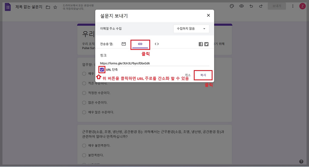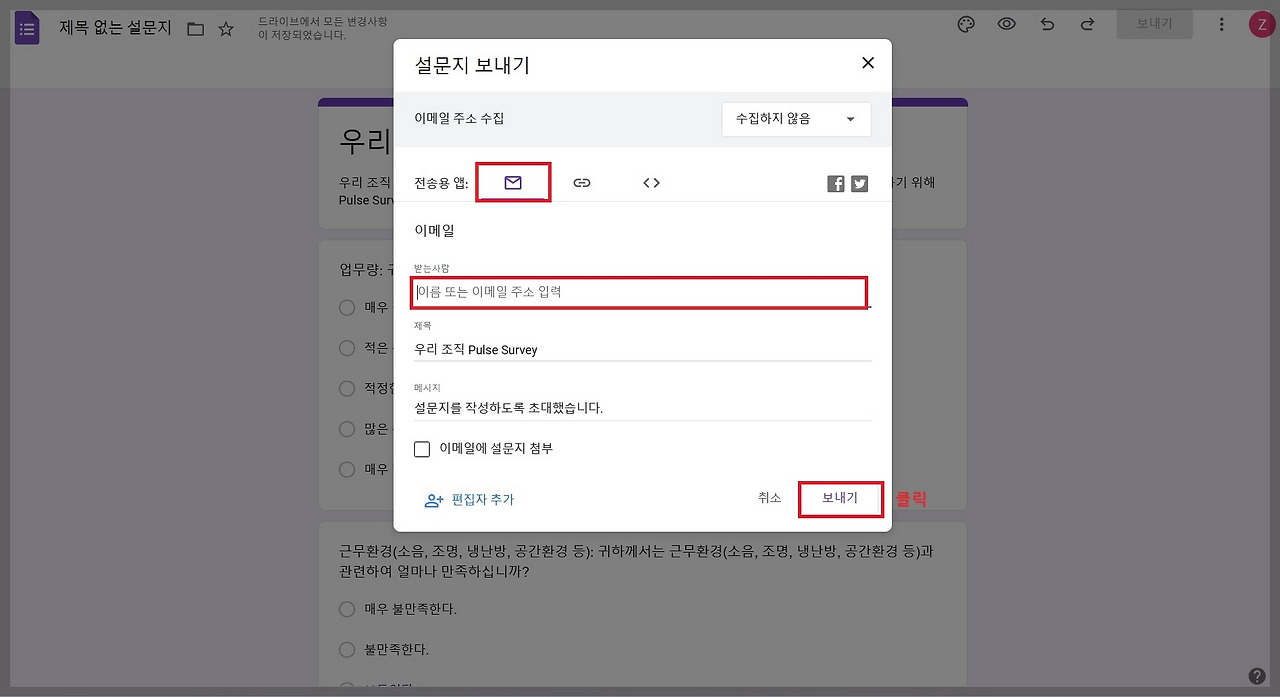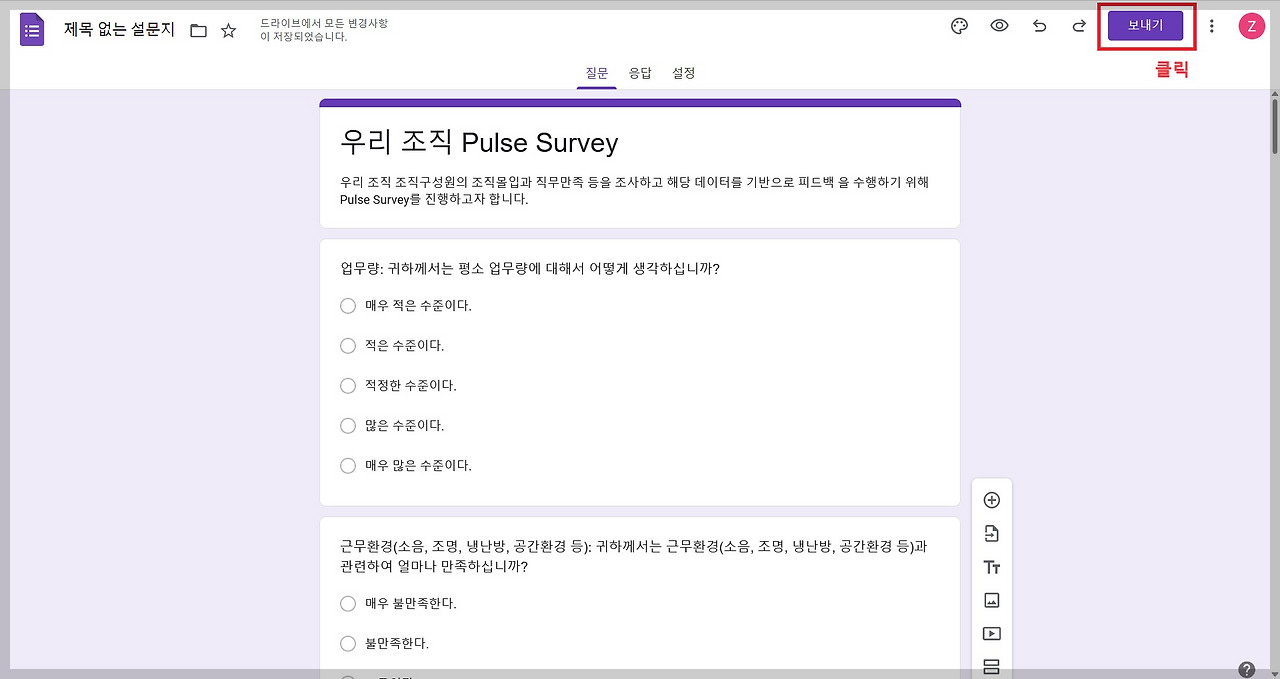 Google Forms로 설문지를 완성한 후에는 조직 구성원에게 해당 설문지를 전송해야 합니다. Pulse Survey 설문지는 메일, SNS, 문자 등 다양한 방법으로 전송할 수 있습니다.