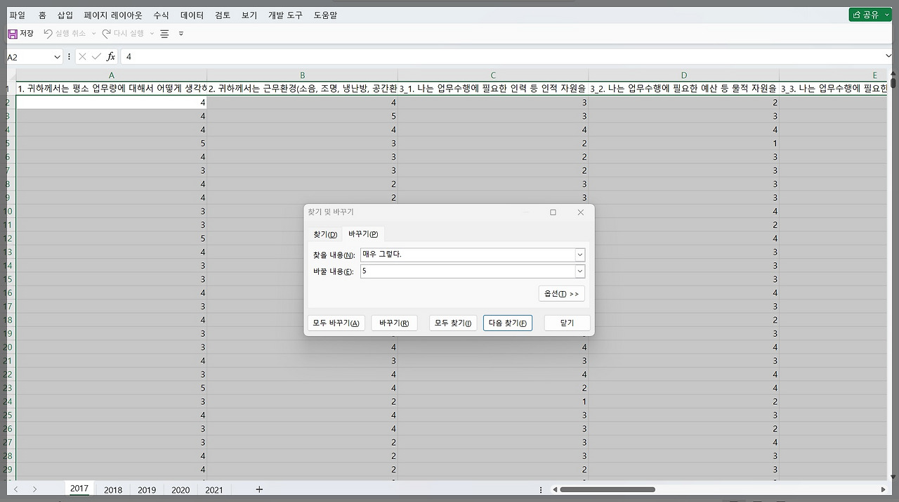 데이터 수집이 완료되면 구글스프레드시트에서 [다운로드] > [Microsoft Excel(.xlsx)]를 클릭하여 서베이 결과를 엑셀 파일로 다운로드 받을 수 있습니다. 5점 리커트 척도의 평균 점수를 구하려면, 엑셀에서 [홈] > [찾기 및 선택] > [바꾸기]를 클릭하고 각 문항을 다음과 같이 변경하여야 합니다.