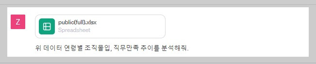 Survey Data를 Advanced Data Analysis에 탑재하여 세대별 근무환경, 업무자원 제공 만족도에 따른 HR 전략 마련을 요청했습니다.