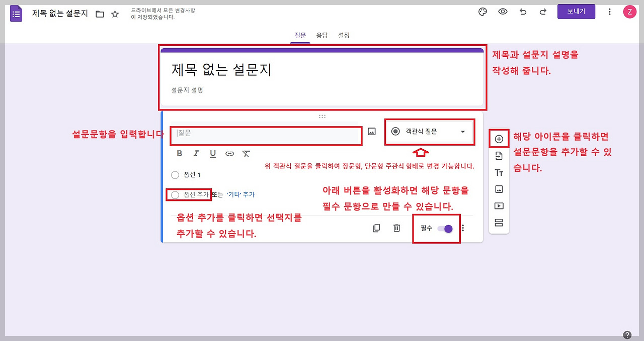 위 그림은 Google Forms 메인화면입니다. 왼쪽 상단의 [새 양식 시작하기]에서 [내용 없음]을 선택하면 설문지 작성 화면으로 전환됩니다. Google Forms를 이용한 설문 작성은 직관적입니다. 먼저 설문지의 제목과 설명을 기입하고, 원하는 문항을 추가합니다. 객관식 질문을 만들고 싶다면 [객관식 질문]을 선택하고, 5점 리커트 척도를 원할 경우 [옵션추가]를 통해 5개의 선택지를 생성한 뒤, 해당 내용을 기입합니다. '필수' 옵션을 활성화하면 응답자가 해당 문항에 반드시 응답하도록 설정할 수 있습니다. 추가 문항은 + 버튼을 통해 쉽게 추가할 수 있습니다.