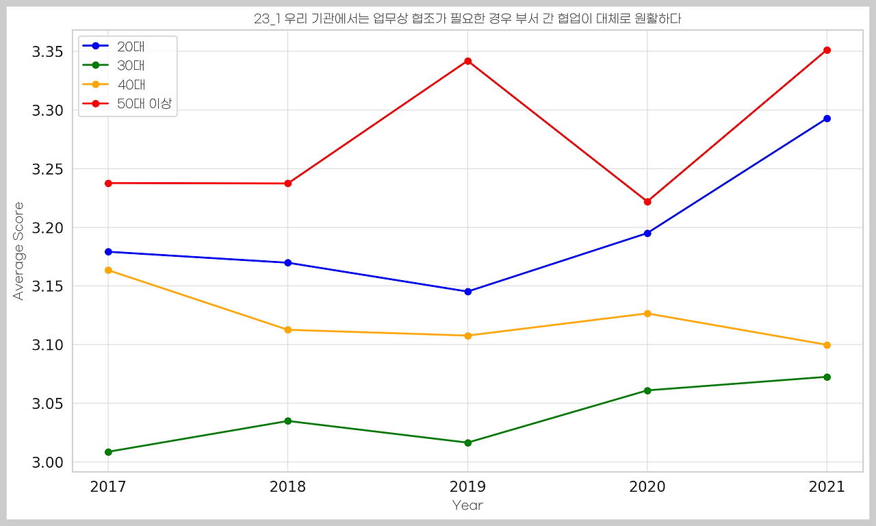 협력 및 의사소통 측면에서 30대와 40대, 즉 조직 허리 계층 구성원의 인식이 다른 연령대에 비해 상대적으로 낮게 나타났습니다. 이러한 경향은 여러 년도에 걸쳐 지속적으로 나타나고 있습니다.
