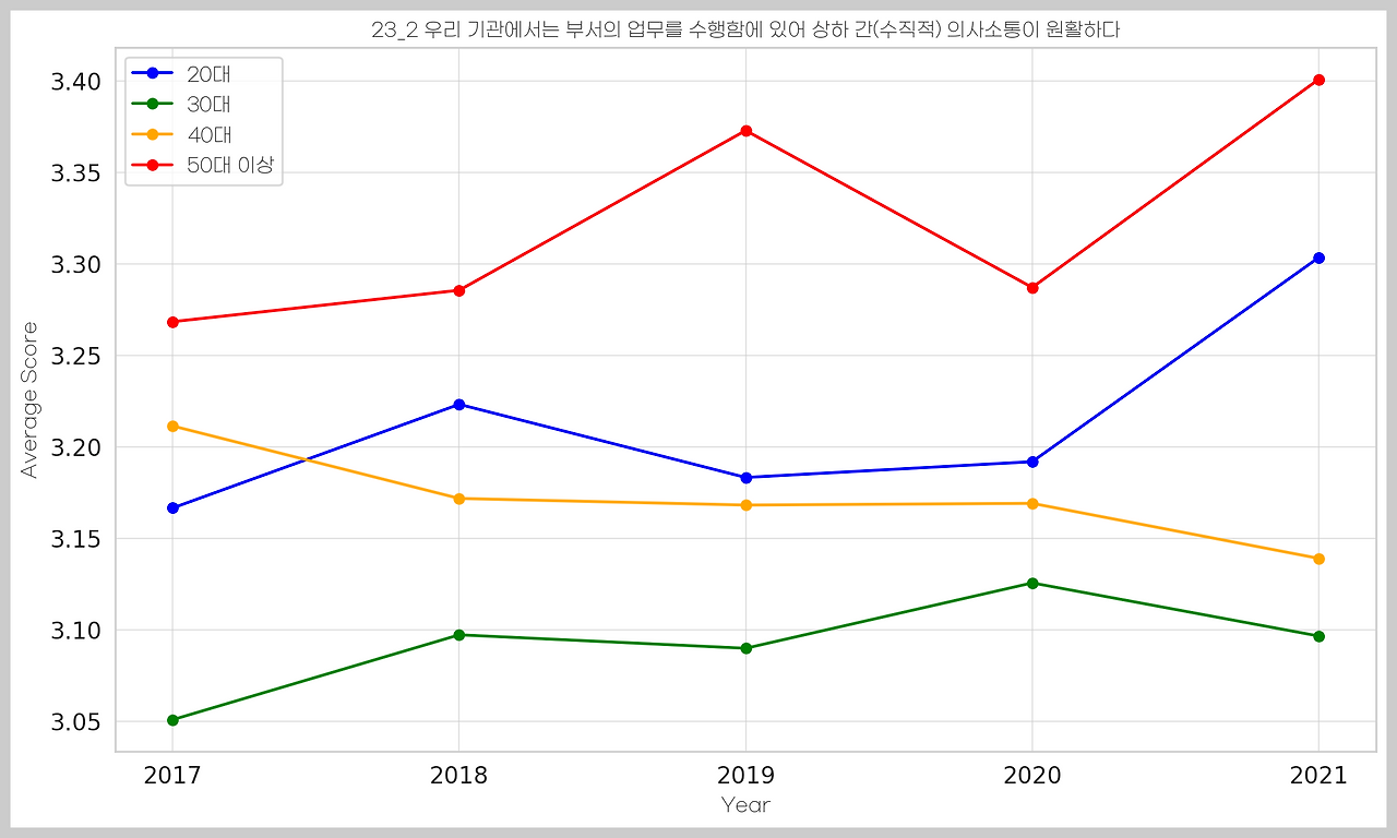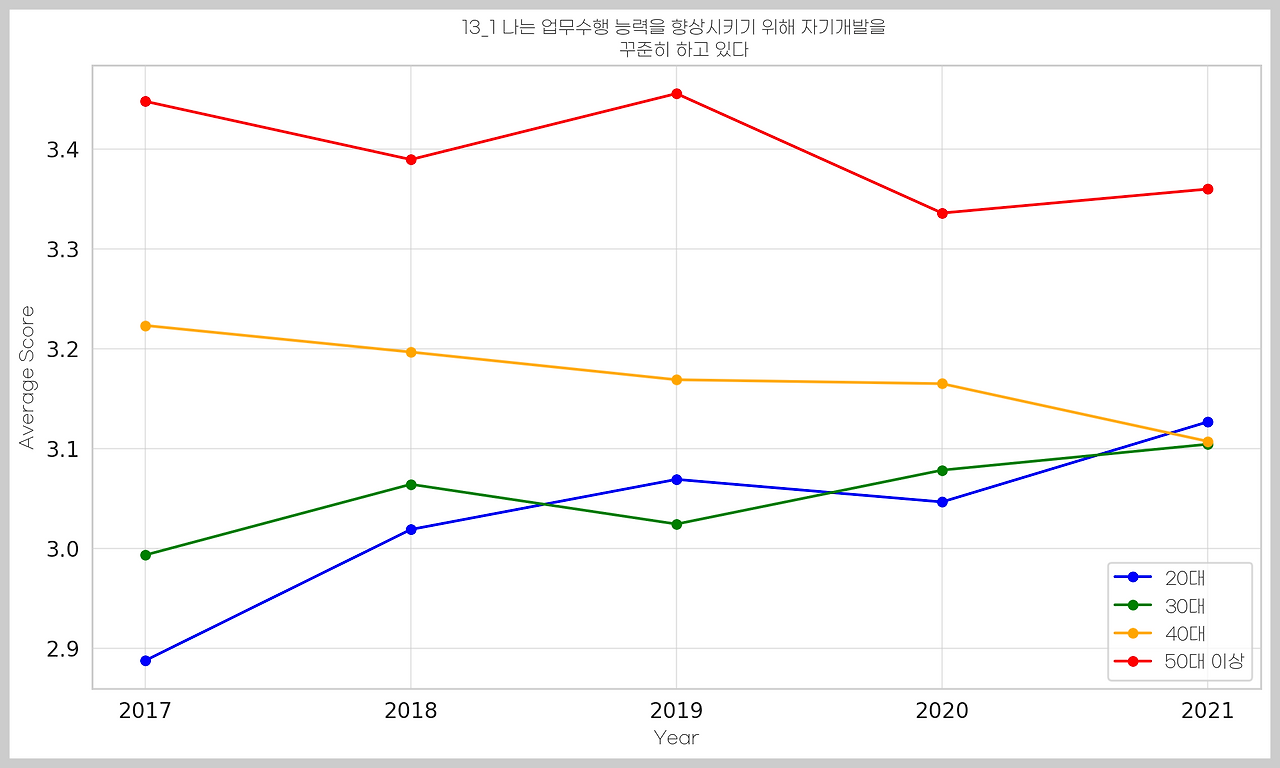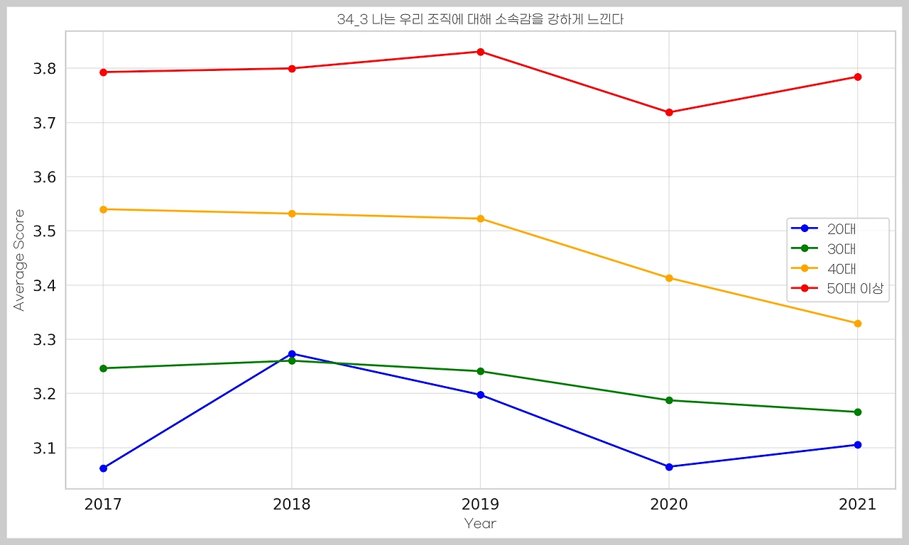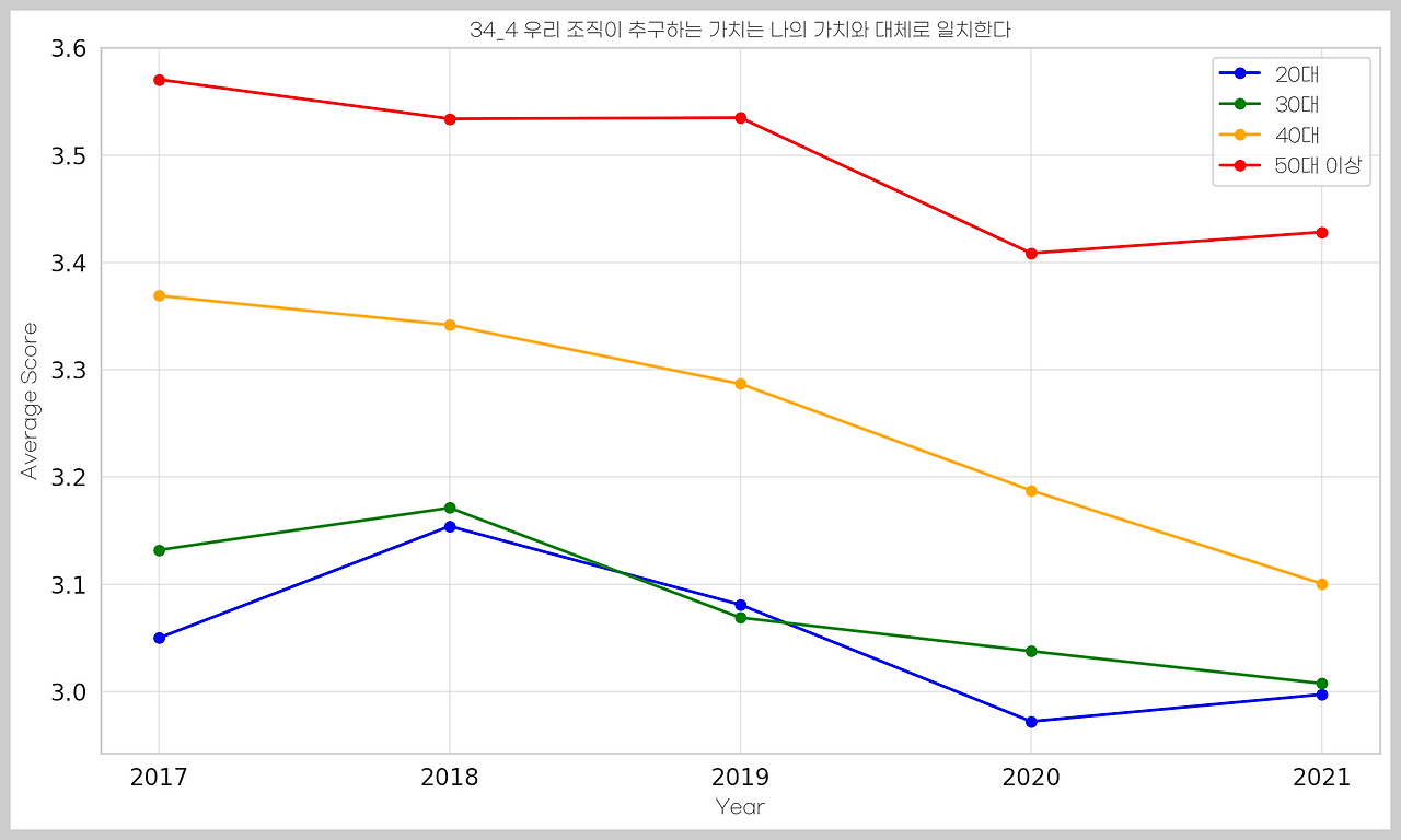 아래의 그래프는 Chat GPT에게 분석을 요청하여 받은 2017년~2021년 조직구성원 인식의 연령대에 따른 경향 그래프입니다.