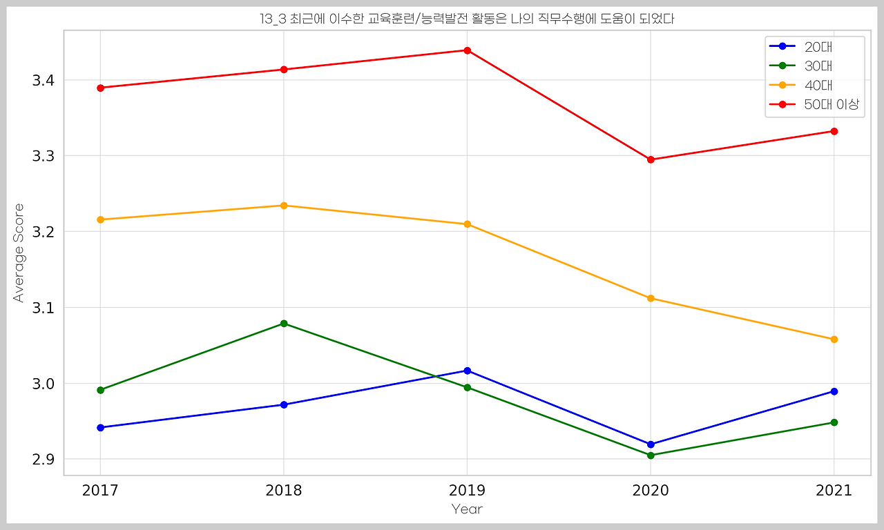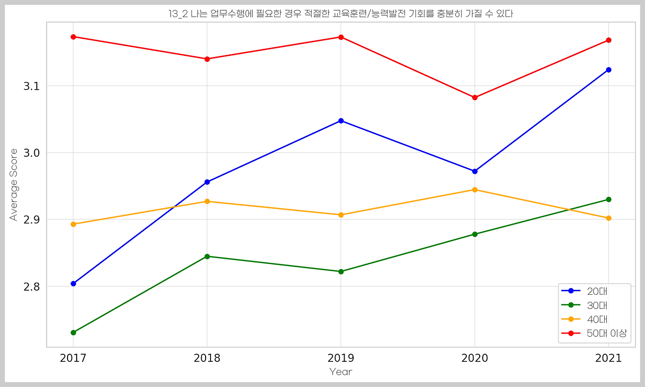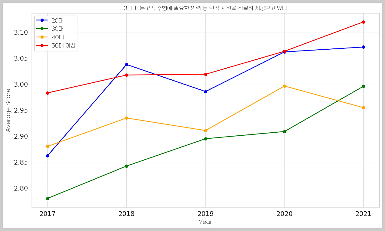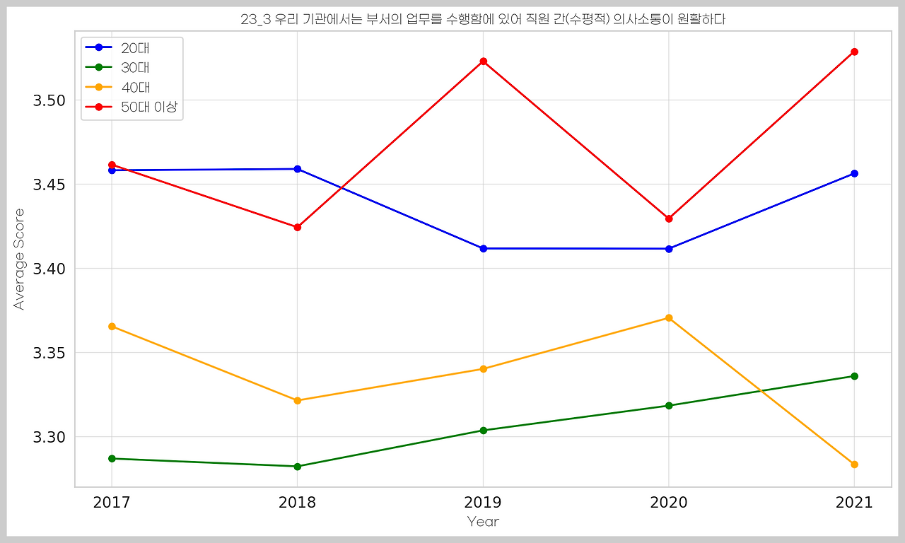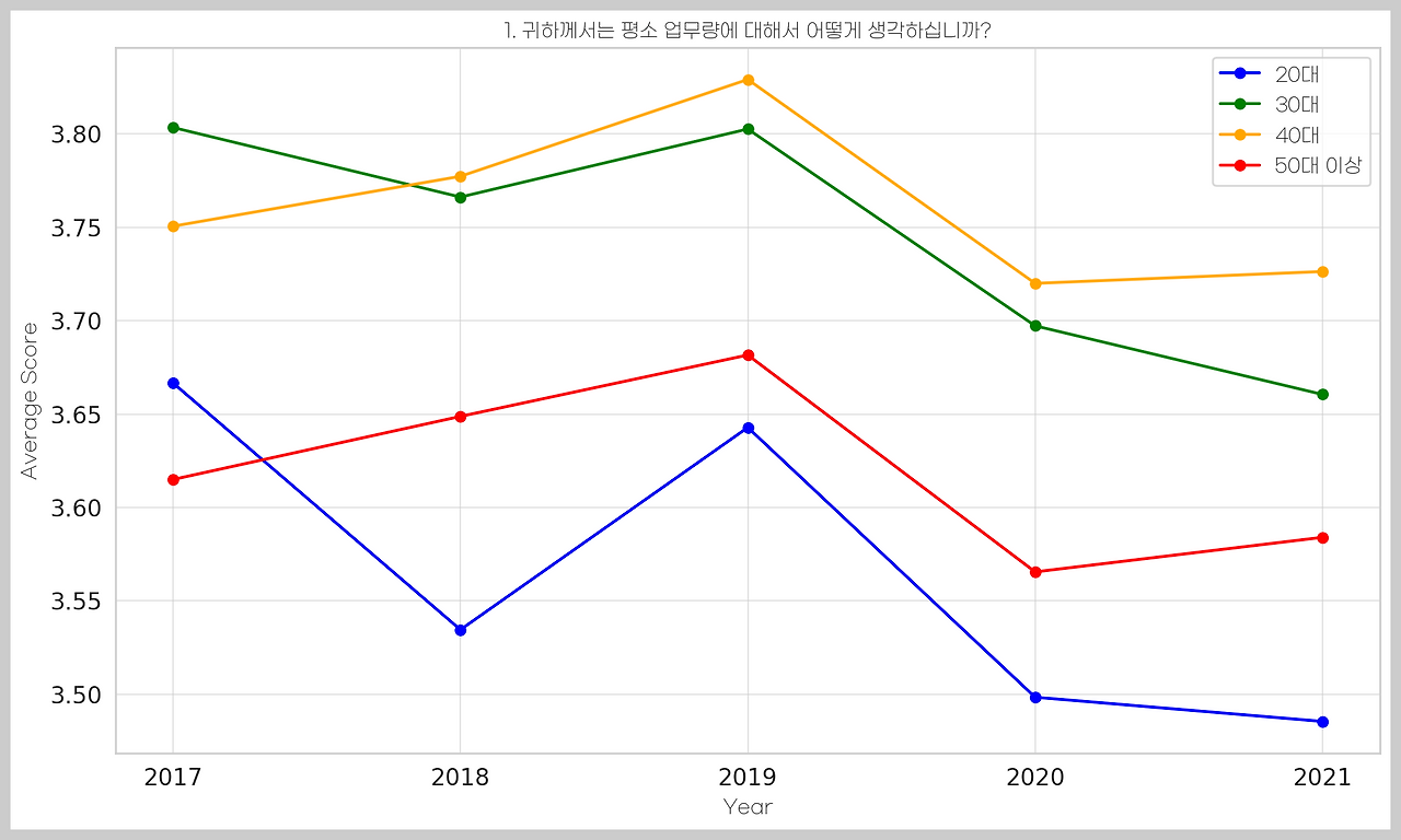 아래의 그래프는 Chat GPT에게 분석을 요청하여 받은 2017년~2021년 조직구성원 인식의 연령대에 따른 경향 그래프입니다.