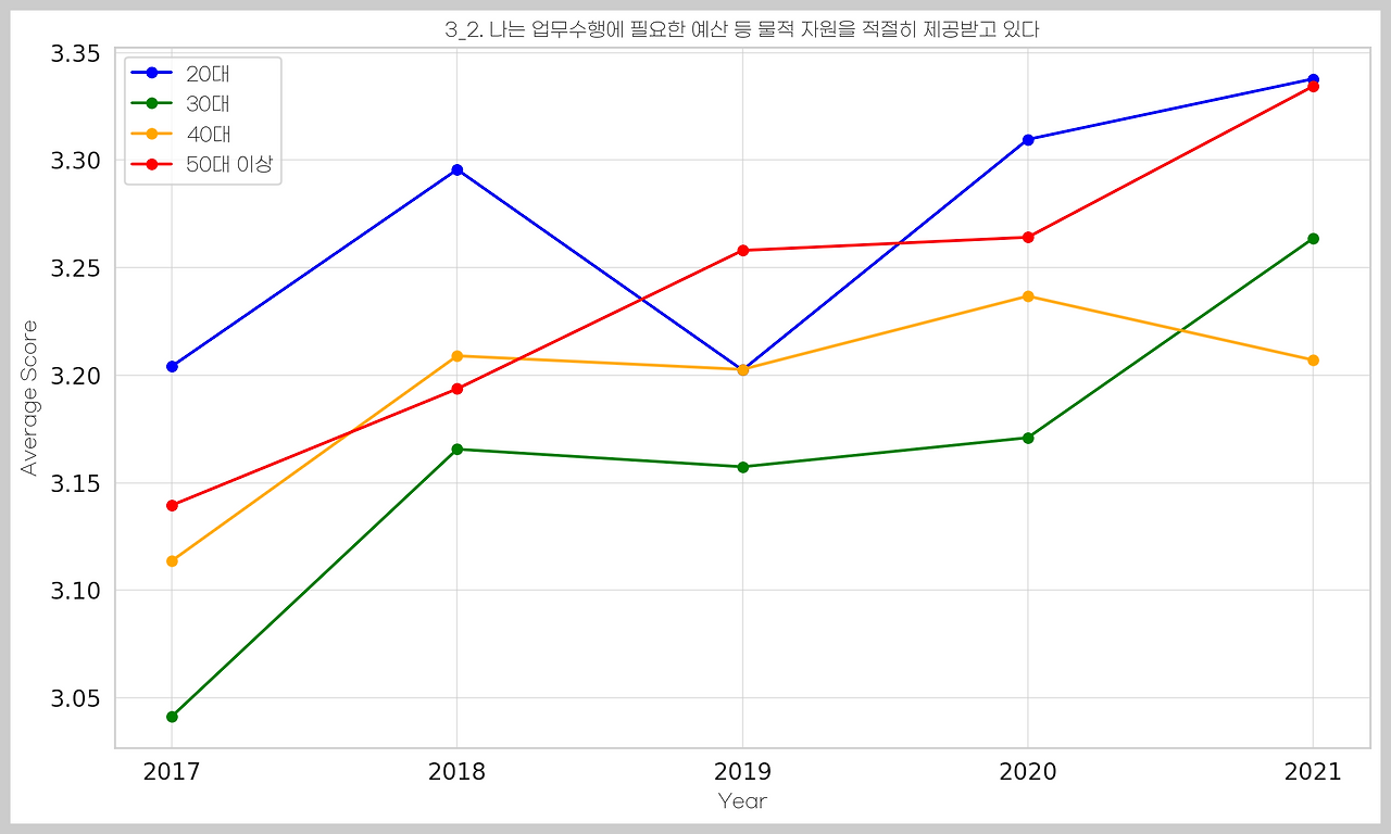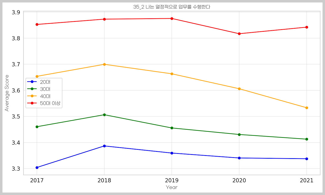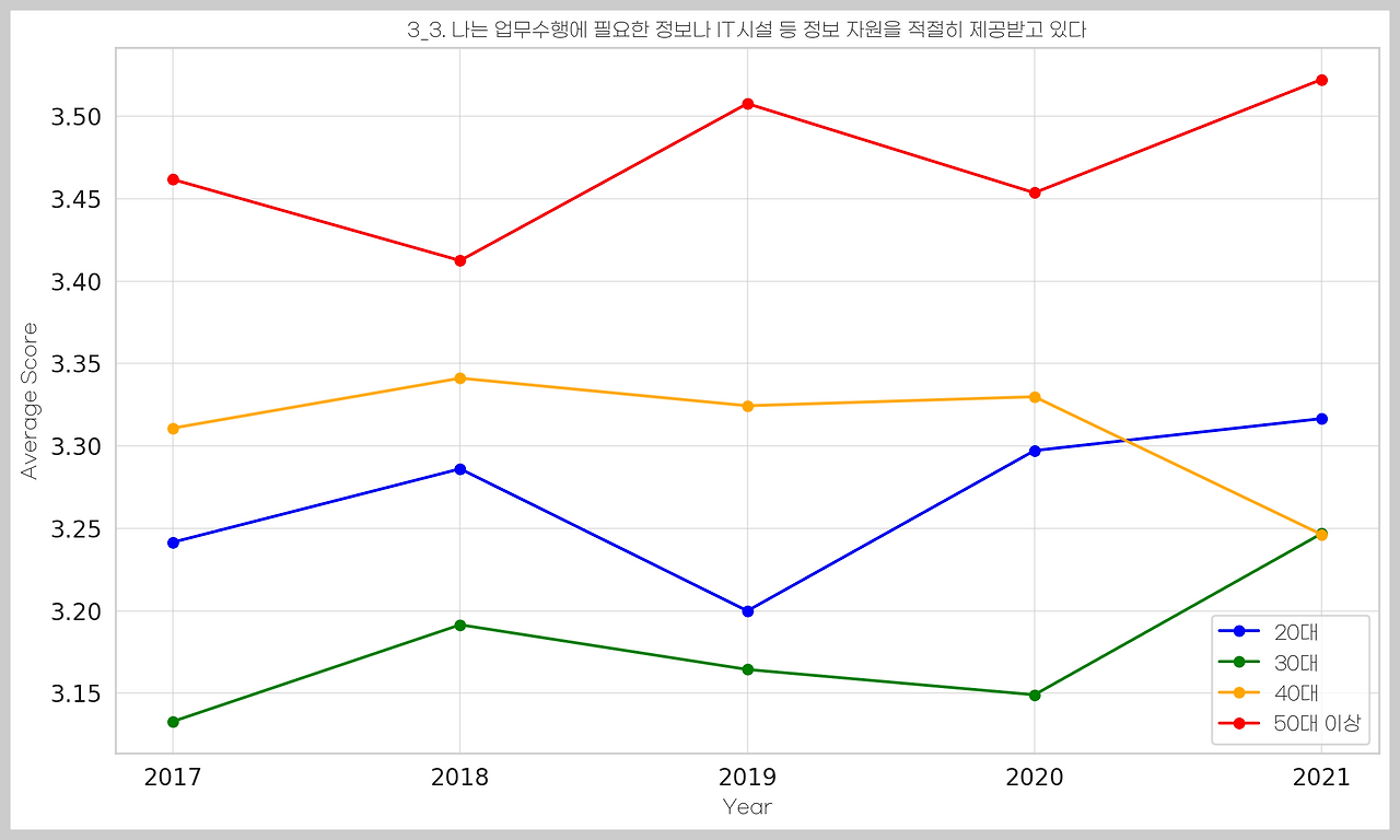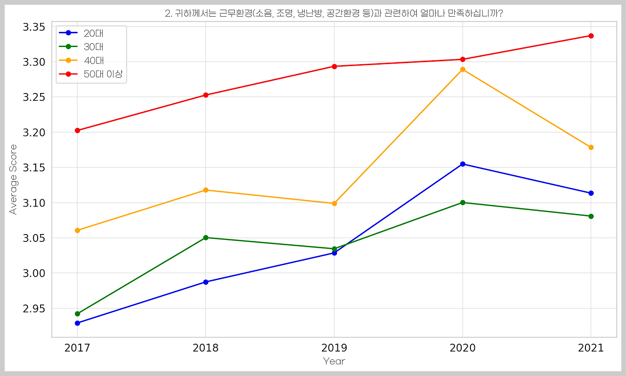 아래의 그래프는 Chat GPT에게 분석을 요청하여 받은 2017년~2021년 조직구성원 인식의 연령대에 따른 경향 그래프입니다.