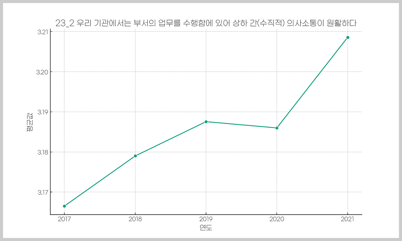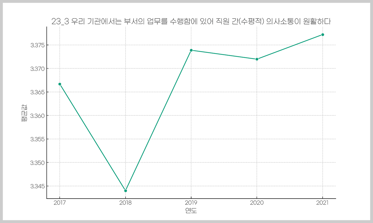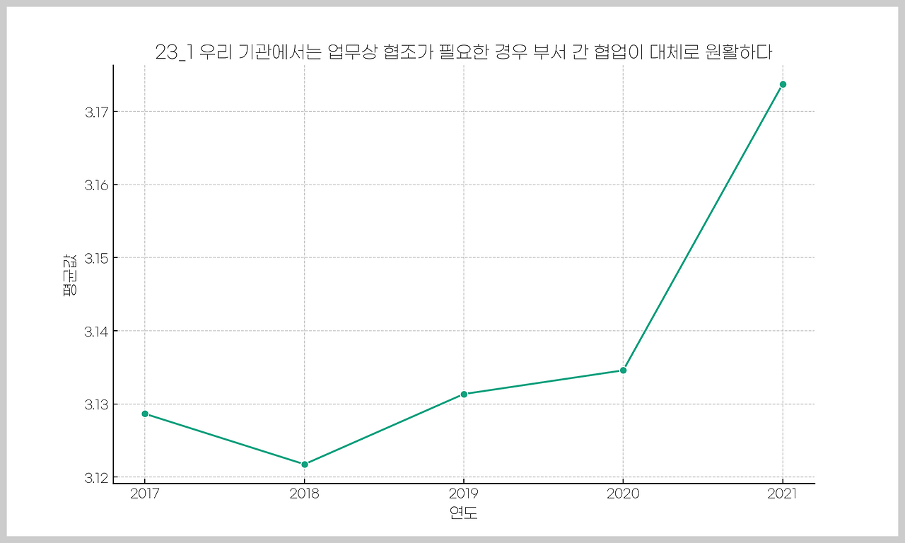 2017년부터 2021년까지 부서 간의 협업과 수직적 의사소통은 전반적으로 증가하는 추세를 보였습니다. 또한, 수평적 의사소통은 2021년에 2017년부터 2020년까지의 기간에 비해 상대적으로 더 높은 평균 점수를 기록하였습니다.