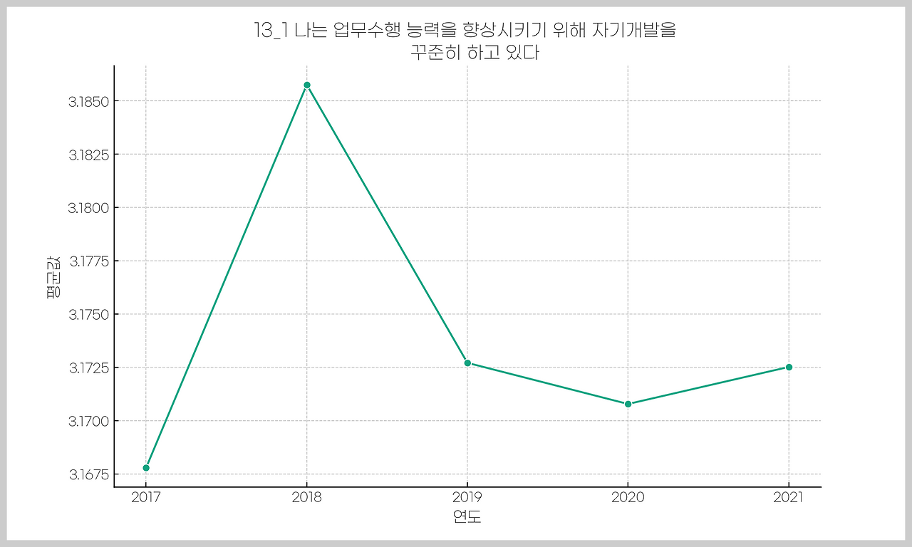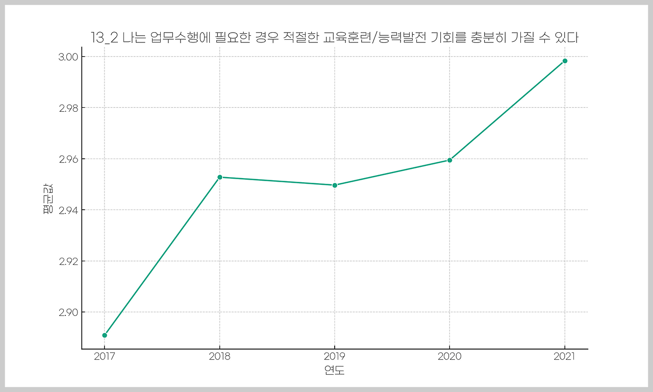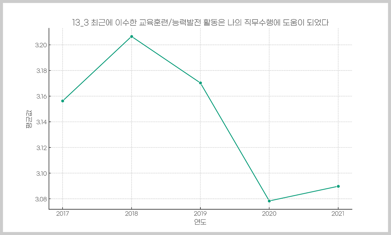 2017년부터 2021년까지의 기간 동안 조직 구성원이 교육훈련/능력발전에 대한 인식 평균 추이에는 뚜렷한 경향성이 나타나지 않았습니다. 다만, 교육훈력/능력발전 기회 제공에 대한 인식은 전반적으로 상승하는 경향을 보이고 있습니다.