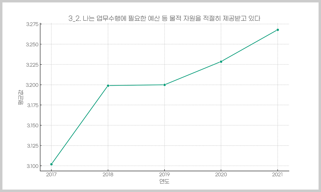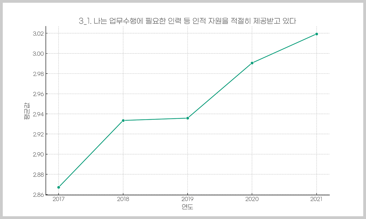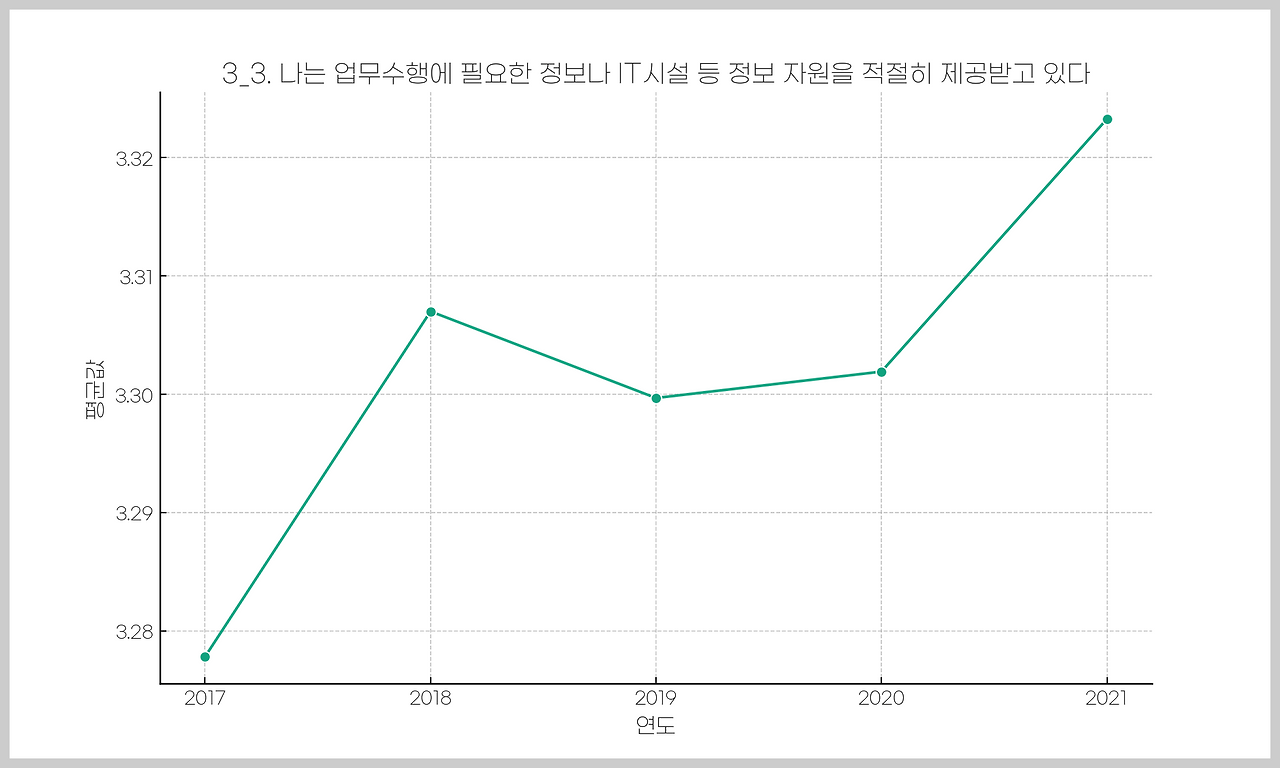 근무환경(소명, 조명, 냉난방, 공간환경 등)은 2021년에 하락하긴 했지만 전체적으로는 상승하는 추세를 보여주고 있습니다. 업무수행에 필요한 자원(인적자원, 물적자원, IT 자원) 제공 또한 2019년 IT 자원 제공을 제외하고는 전체적으로 상승하는 추세를 보이고 있습니다.