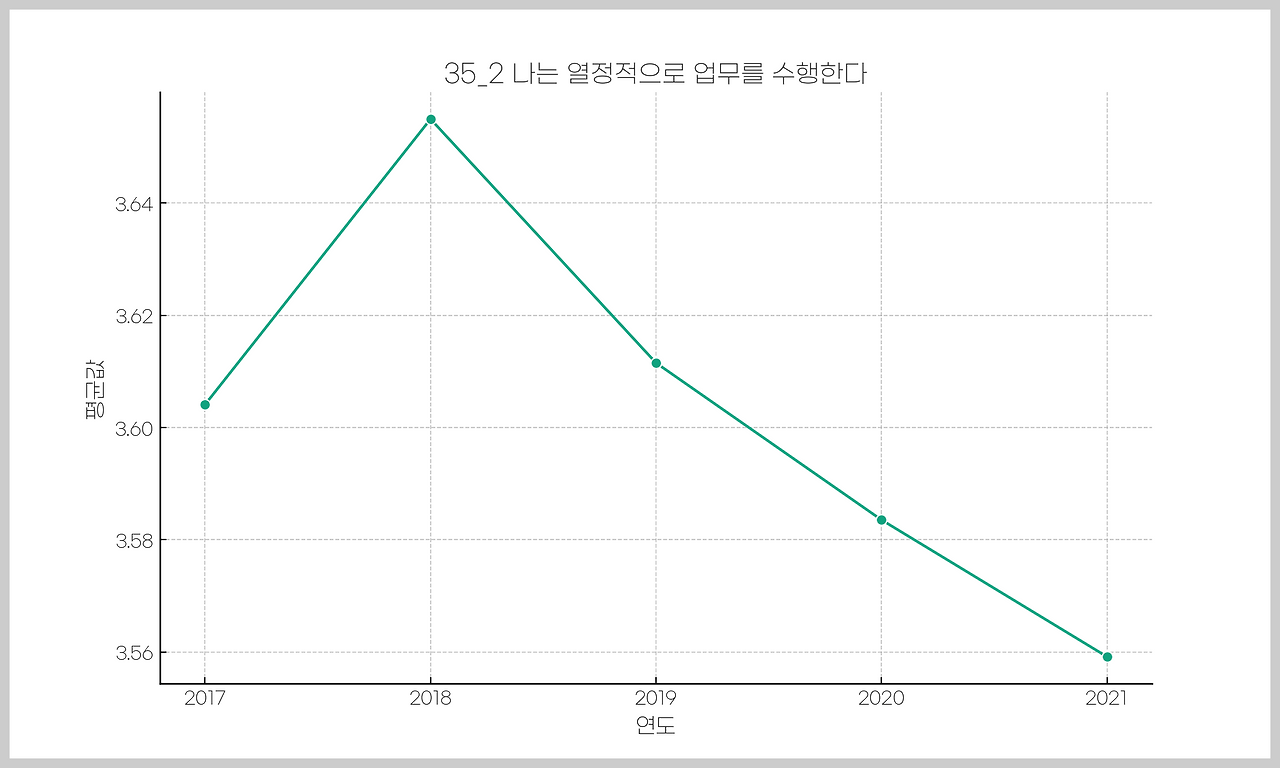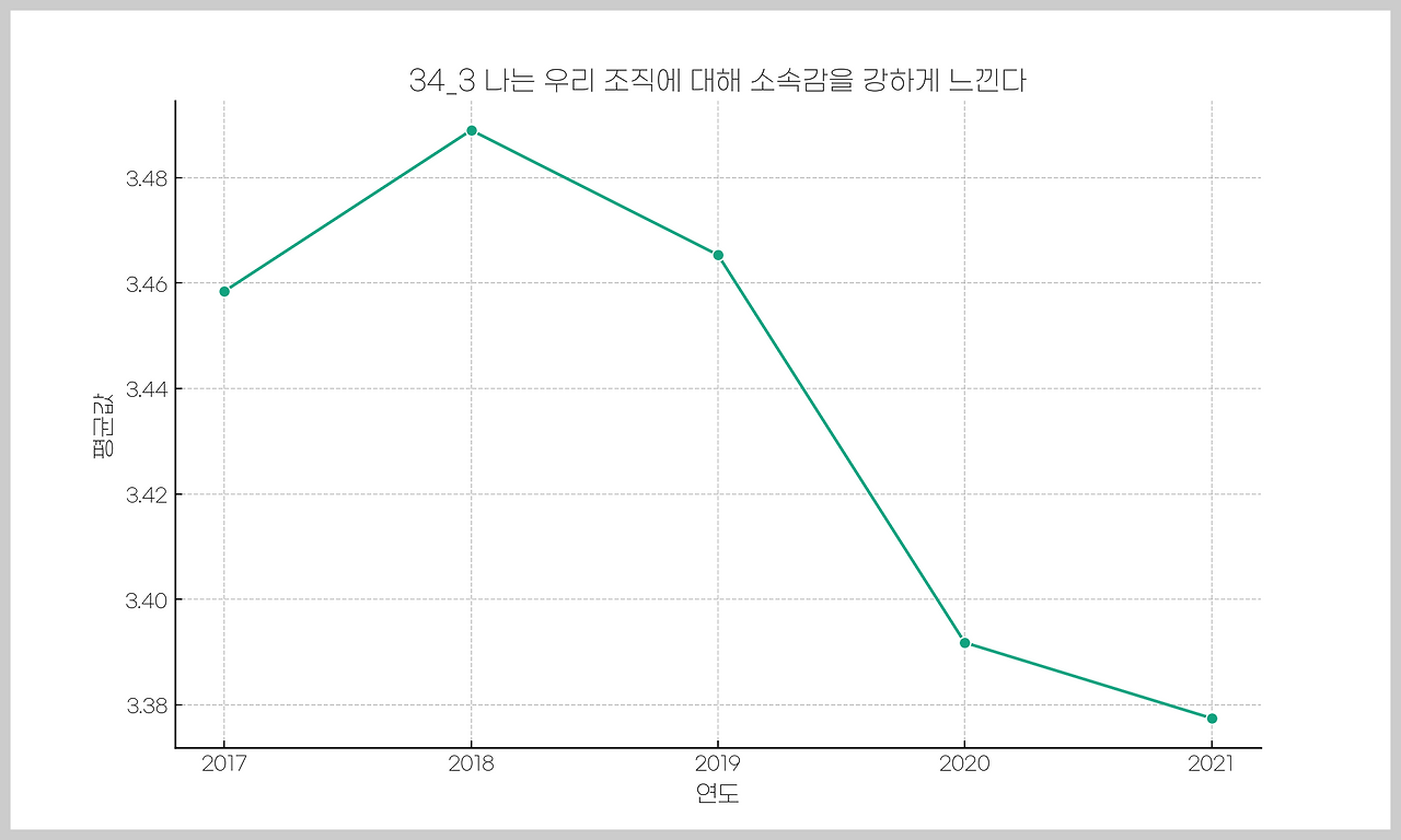 2017년부터 2021년까지 세대별 조직몰입은 일관된 경향을 보였습니다. 연령이 높아질수록 조직몰입이 증가하는 반면, MZ세대(20대, 30대)의 조직몰입은 상대적으로 낮게 나타났습니다.
