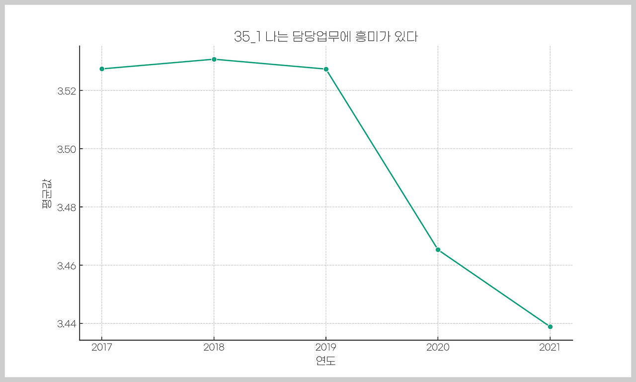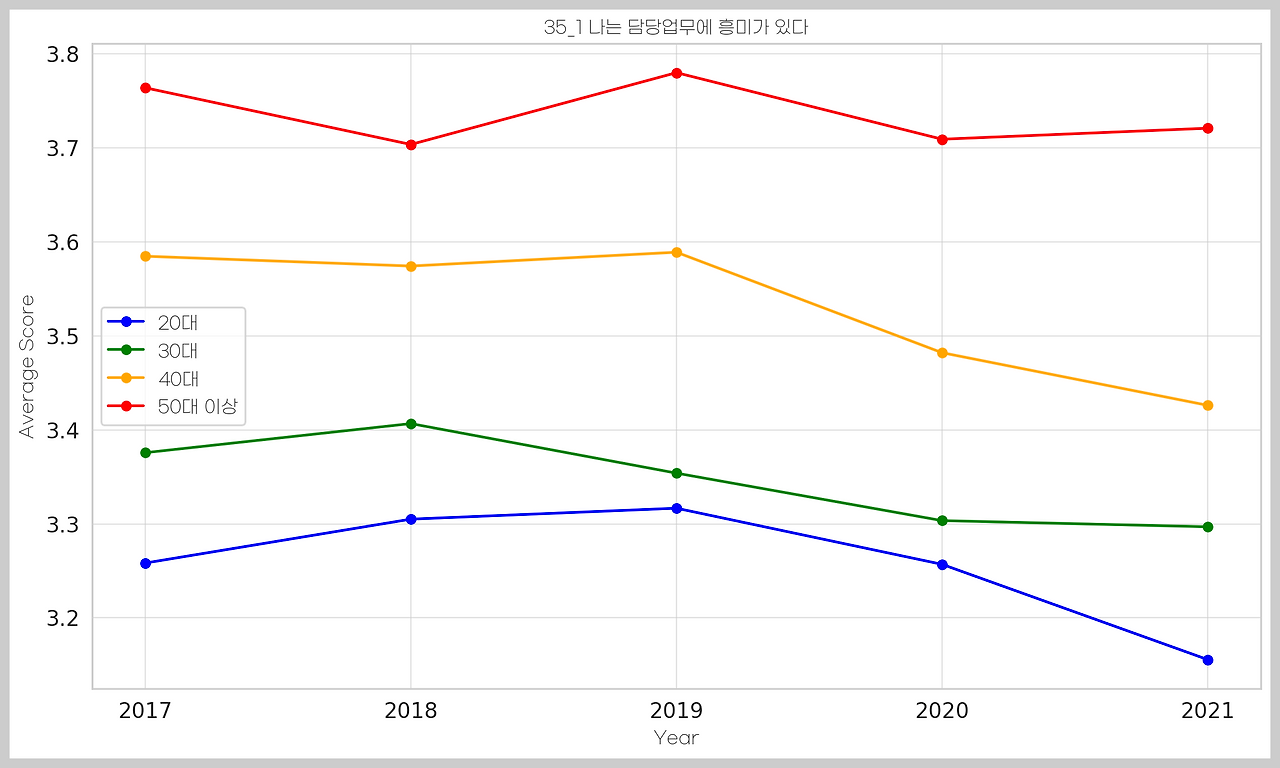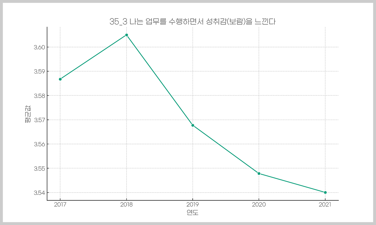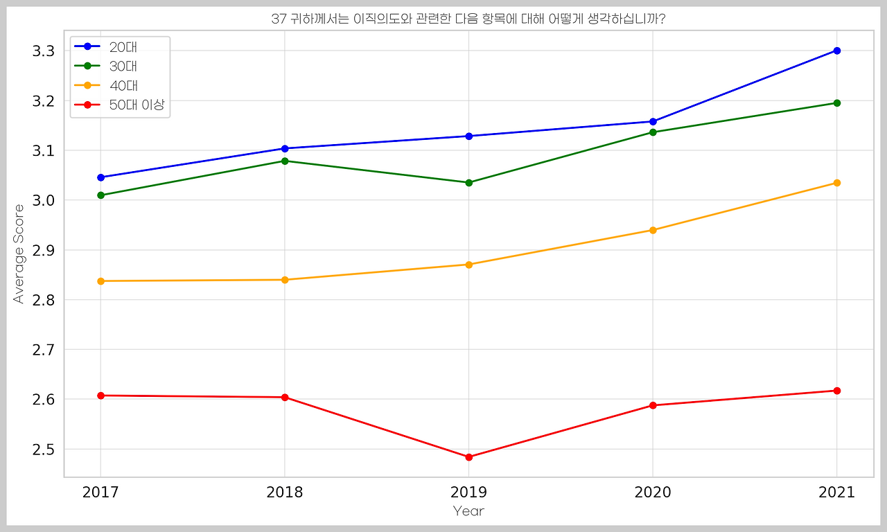 2017년부터 2021년까지 직무만족 인식 역시 일관된 경향을 보였습니다. 연령이 높아질수록 직무만족이 증가하는 반면, MZ세대(20대, 30대)에서는 직무만족이 상대적으로 낮게 나타났습니다.