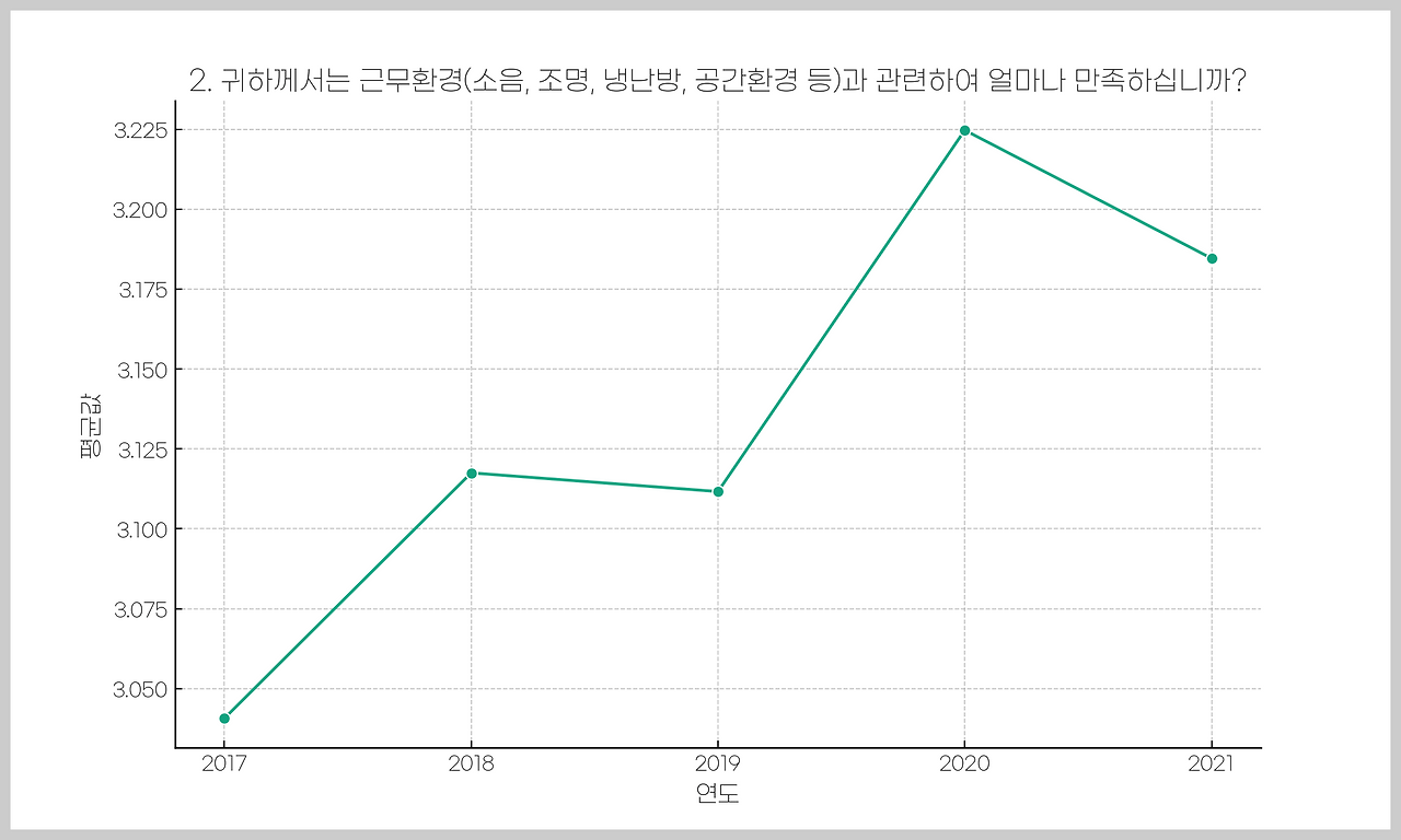 아래의 그래프는 Chat GPT에게 분석을 요청하여 받은 2017년~2021년 시간에 따른 조직구성원 인식 경향 그래프입니다.