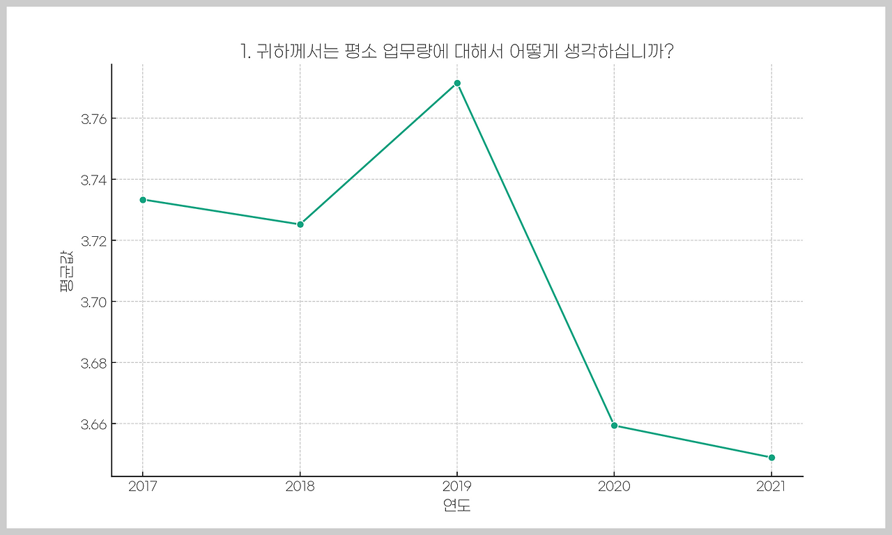 2017년부터 2021년까지의 기간 동안 조직 구성원이 업무량에 대한 인식의 평균 추이에는 뚜렷한 경향성이 나타나지 않았습니다.