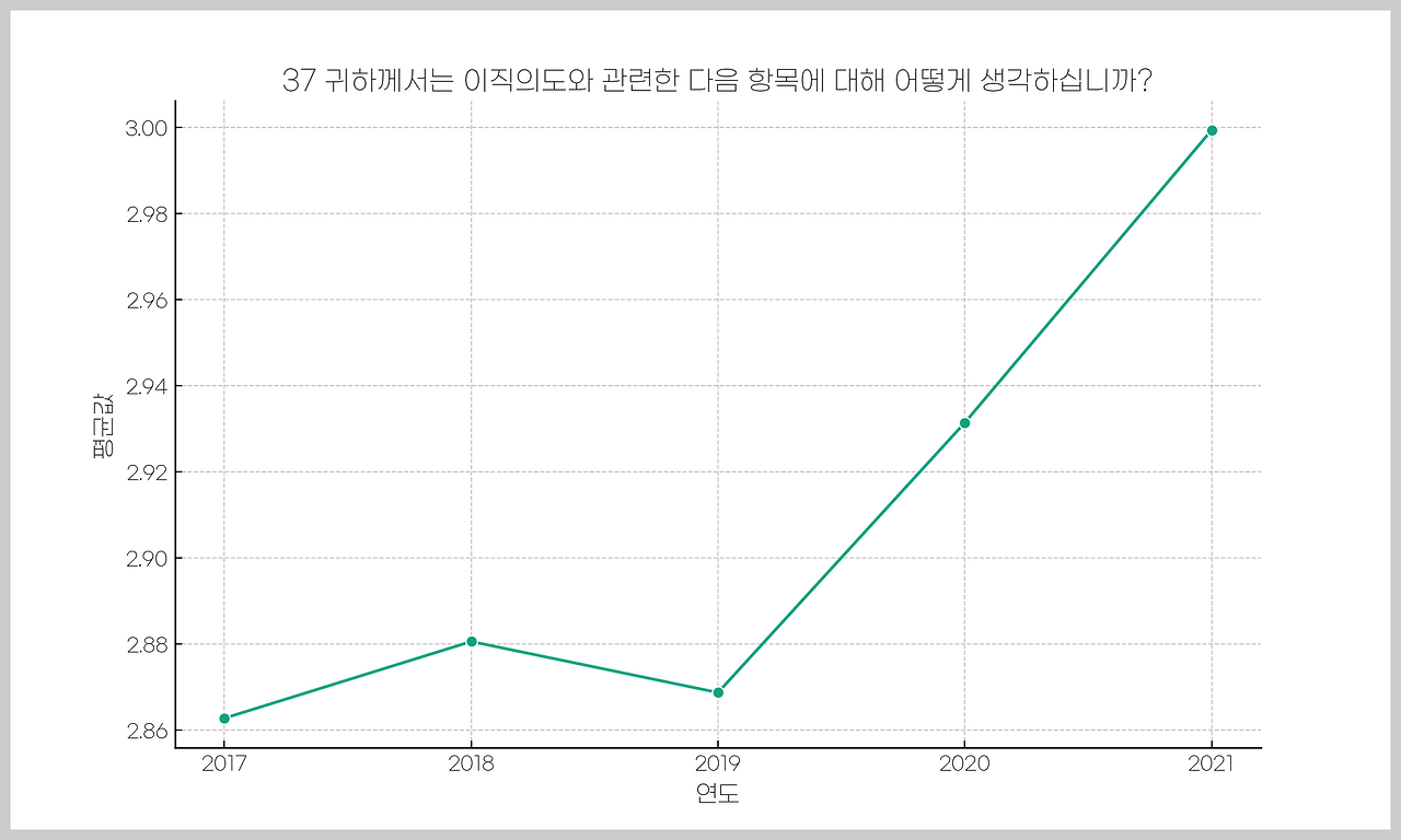 2017년~2021년 기간 동안 조직구성원의 이직의도에 대한 인식은 전반적으로 증가하는 추세를 보이고 있습니다.