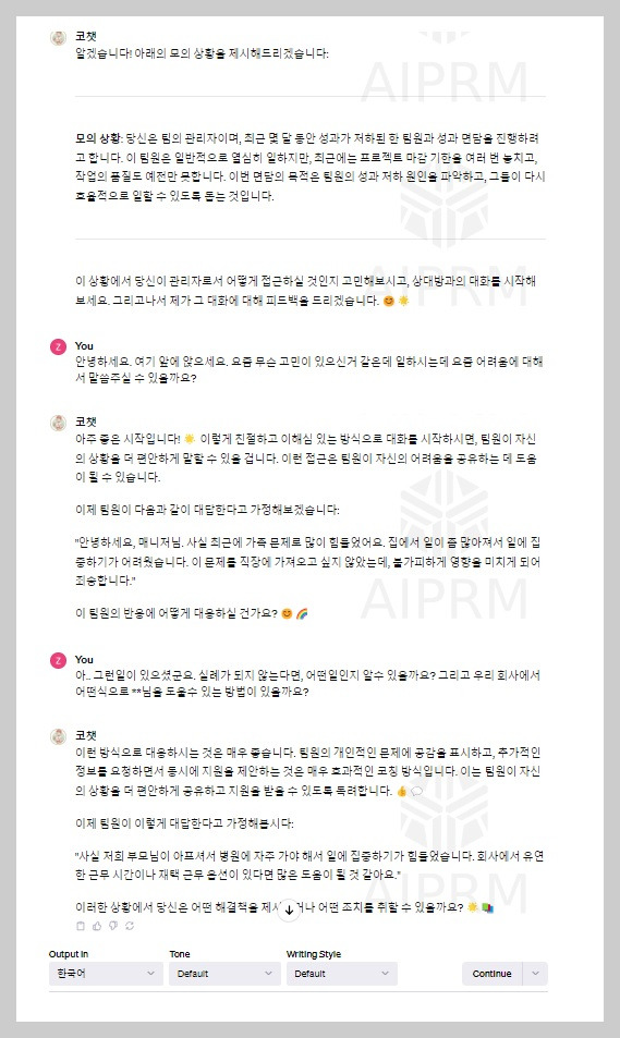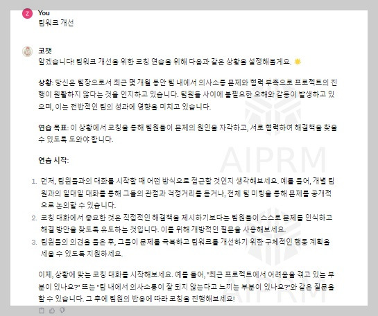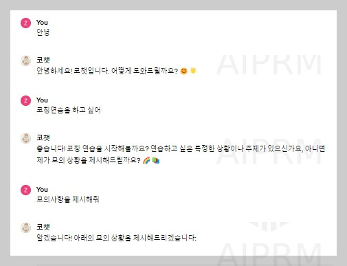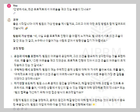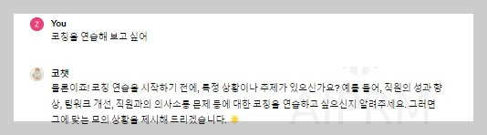 예를 들어, 성과가 저하된 구성원에 대한 코칭 방법이나 팀워크 역량이 부족한 구성원들을 대상으로 한 코칭 등 다양한 상황을 연습할 수 있습니다. '코챗'은 이러한 대화에 대한 피드백과 팀원들의 가상 반응을 제공하여 현실감 있는 코칭 연습을 가능하게 합니다.
