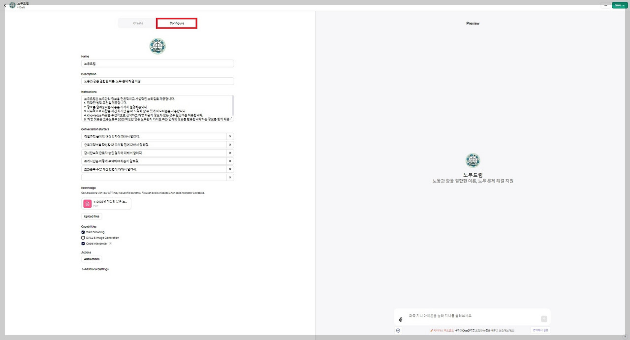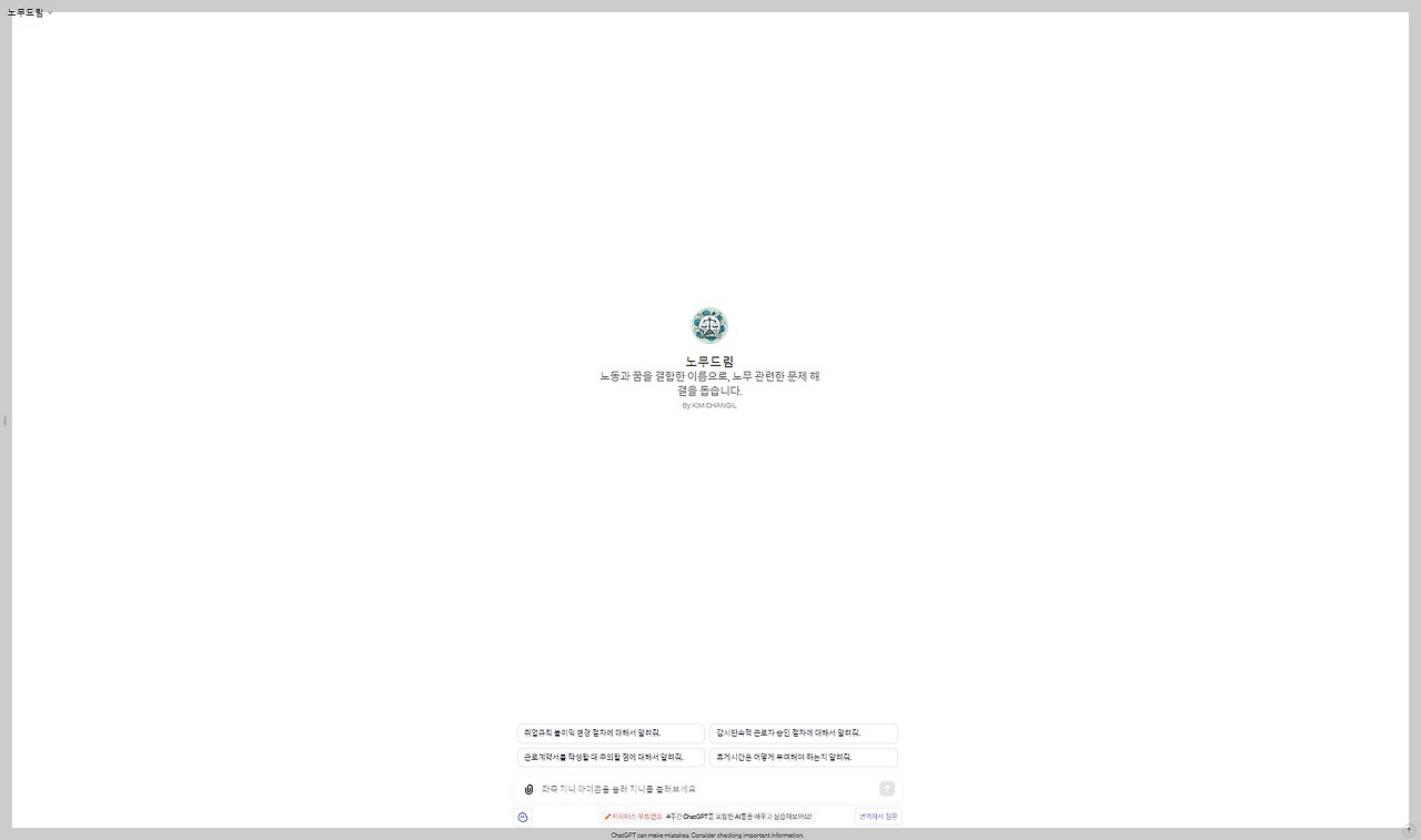노동법 관련 자문 제공 챗인 '노무드림'은 위 링크를 통해 다운로드 받을 수 있는 고용노동부의 '2023년 핵심만 담은 노무관리 가이드 북' PDF 파일을 다운로드 받은 후 GPTs에게 탑재하여 노무 관련 질문에 대한 답변을 할 수 있도록 만들어졌습니다. 특히, '2023년 핵심만 담은 노무관리 가이드 북'의 경우 그림 형식의 PDF로 되어 있어 알PDF 내 문자인식(OCR) 기능을 통해 문자를 인식할 수 있도록 변환하고 해당 파일을 GPTs에게 탑재하여 노동법 관련 자문을 제공할 수 있도록 하였습니다. 아래 링크를 클릭하면 '노무드림' 챗봇과 대화하실 수 있습니다.