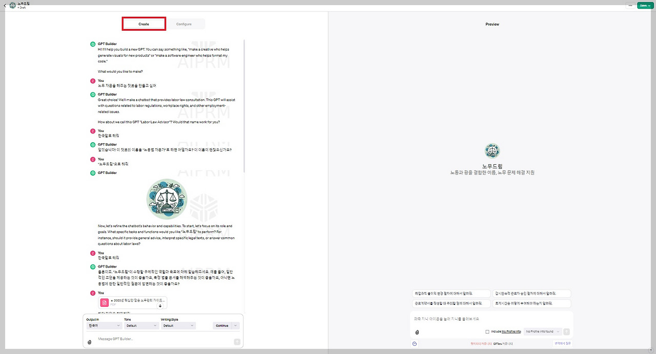 GPTs에서 챗봇을 만드는 첫 번째 방법인 Create 모드에 대해서 설명드리겠습니다. Create 모드는 채팅 형식으로 GPT와 대화를 하며 챗봇을 만드는 방식입니다. 아래 대화창에 '노무 자문을 해주는 챗봇을 만들고 싶어'라고 프롬프팅 하여 챗봇을 생성하면, 챗봇의 이름을 물어봅니다. 이름을 답하고 나서는 이름에 어울리는 아이콘도 형성해 줍니다. 이와 같은 방식으로 대화를 진행하며 챗봇을 완성해 나갈 수 있습니다.