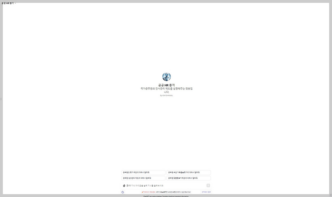 '공공 HR 총끼'는 국가공무원 인사관리 제도를 안내하는 챗봇입니다. 이 챗봇은 '2023 공무원 인사실무' 등 인사혁신처 발간물 PDF 파일을 기반으로 제작되었습니다. 제공된 링크를 통해 '공공 HR 총끼'와 대화를 시작할 수 있습니다.
