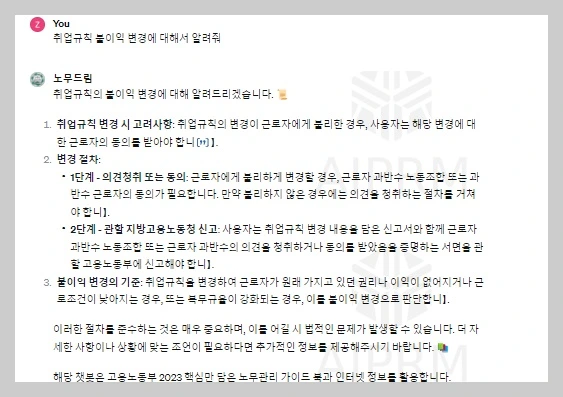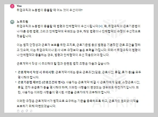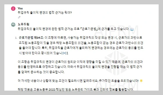 '노무드림'은 노동과 꿈을 결합한 이름으로, 노무 관련 문제 해결을 돕습니다. 이 챗봇은 생성형 AI를 통해 노무 관련 질문에 답변을 제공합니다. 또한 아래 화면에서 확인할 수 있는 바와 같이 상대적으로 정확한 답변을 제공해 줌으로써 이 분야에서 AI의 활용 가능성을 보여주고 있습니다.