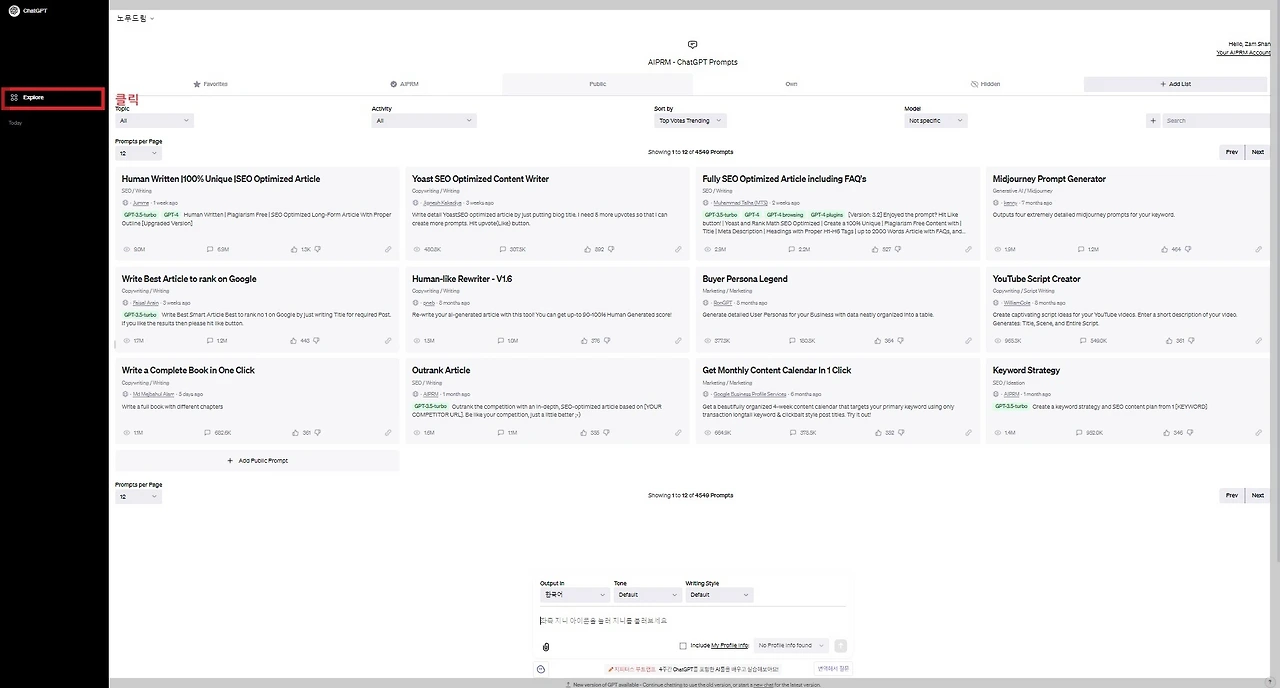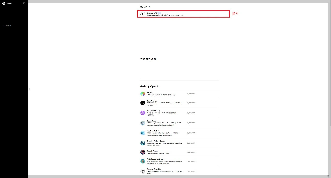 GPTs로 챗봇을 만드는 절차는 매우 간단합니다. 우선 GPTs를 사용하시려면 Chat GPT 유료 사용자여야 합니다. Chat GPT에 접속해서 첫 화면에 왼쪽에 [Explore]를 클릭합니다. 해당 버튼 클릭하면 두 번째 사진과 같이 My GPTs를 가운데 가장 상단에서 확인할 수 있으며 그 아래 [Create a GPT] 버튼을 클릭하여 GPTs를 활성화할 수 있습니다.