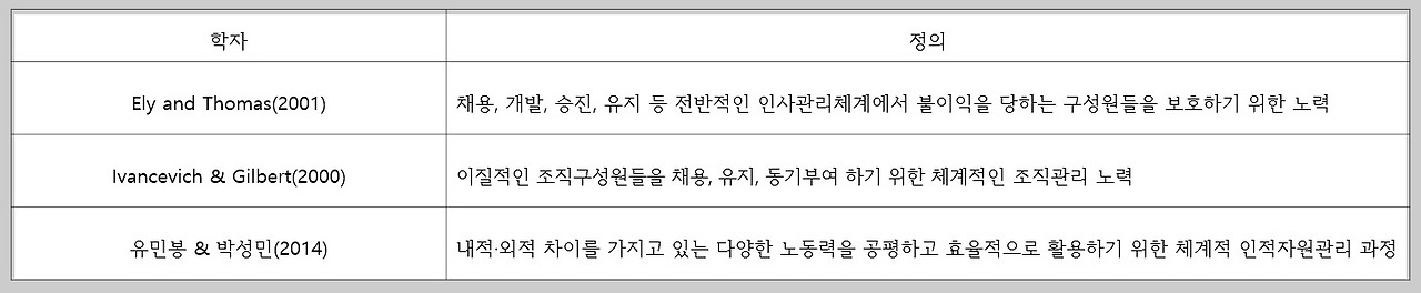 사회구성원 다양성이 증대됨에 따라 조직구성원의 다양성에 대한 관심도 점차 증대하고 있습니다. 또한 조직관리 차원에서는 구성원의 다양성을 관리하기 위한 다양성 관리(Diversity management)가 특히 강조되고 있습니다. 다양성 관리란 조직의 생산성을 높이기 위해 조직 구성원의 다양성을 인정하고 각 구성원이 가지고 있는 능력을 발휘할 수 있도록 조직의 시스템과 핵심적인 문화를 수정하도록 관리하는 것을 의미합니다(Thomas, 1991). 미래에도 사회구성원 다양성이 지속적으로 증대됨에 따라 조직 차원의 다양성 관리는 향후에도 계속 강조될 것으로 예상됩니다. 다양성관리에 대한 학자들의 정의를 살펴보면 다음과 같습니다.